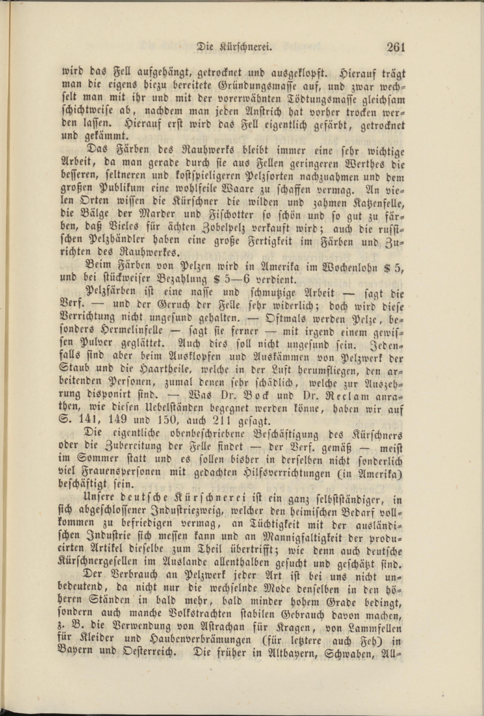 Pelzfärben ist eine nasse und schmutzige Arbeit — sagt die Vers. — und der Geruch der Felle sehr widerlich; doch wird diese Verrichtung nicht ungesund gehalten. — Oftmals werden Pelze, besonders Hermelinfelle — sagt sie ferner — mit irgend einem gewissen Pulver geglättet. Auch dies soll nicht ungesund sein. Jedenfalls sind aber beim Ausklopfen und Auskämmen von Pelzwerk der Staub und die Haartheile, welche in der Luft herumfliegen, den arbeitenden Personen, zumal denen sehr schädlich, welche zur Auszehrung disponirt sind. — Was Dr. Bock und Dr. Reclam anra- then, wie diesen Uebelständen begegnet werden könne, haben wir auf S. 14 i, 149 und 150, auch 21 l gesagt.