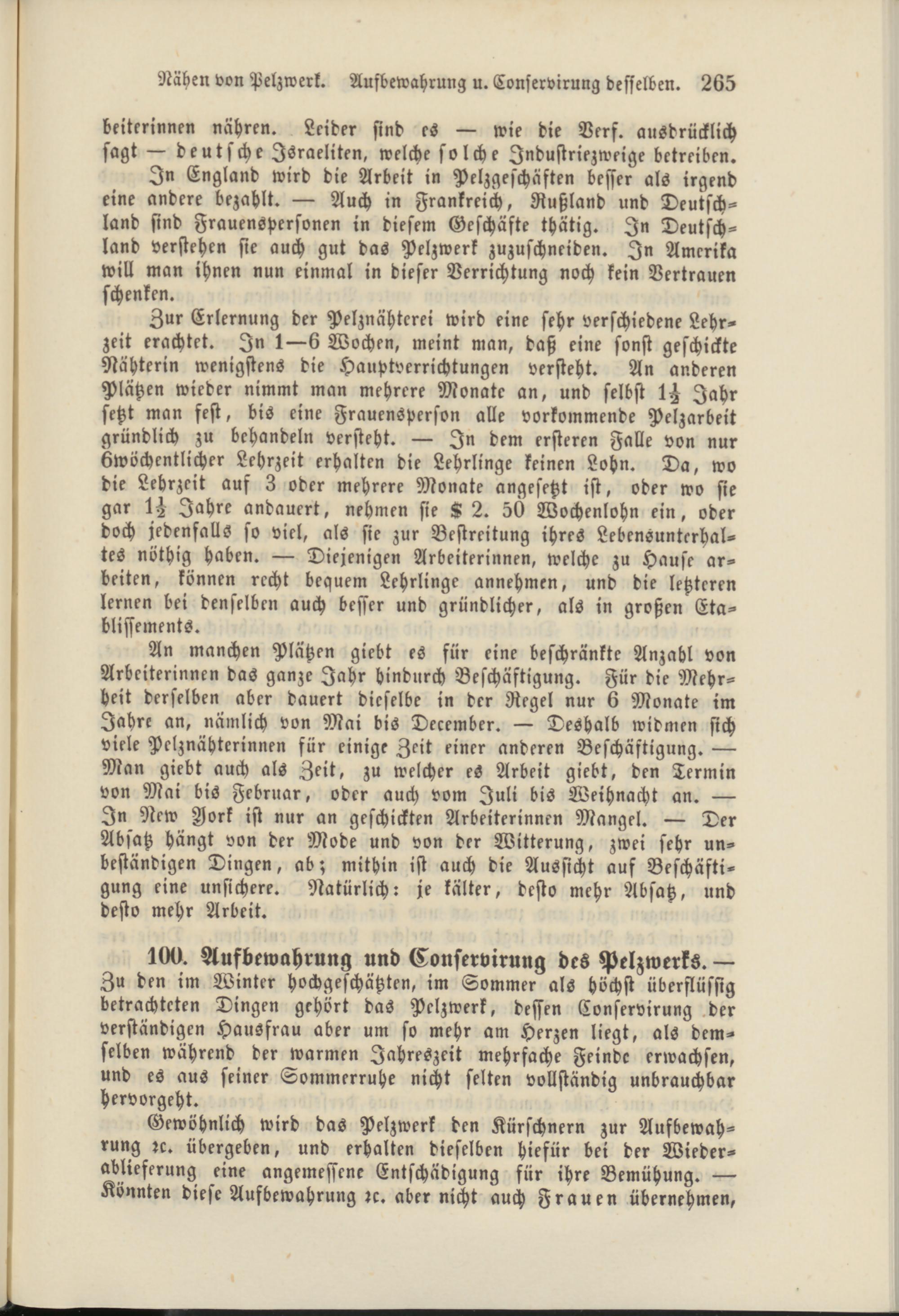 An manchen Plätzen giebt es für eine beschränkte Anzahl von Arbeiterinnen das ganze Jahr hindurch Beschäftigung. Für die Mehrheit derselben aber dauert dieselbe in der Regel nur 6 Monate im Jahre an, nämlich von Mai bis December. — Deshalb widmen sich viele Pelznähterinnen für einige Zeit einer anderen Beschäftigung. — Man giebt auch als Zeit, zu welcher es Arbeit giebt, den Termin von Mai bis Februar, oder auch vom Juli bis Weihnacht an. — In New Jork ist nur an geschickten Arbeiterinnen Mangel. — Der Absatz hängt von der Mode und von der Witterung, zwei sehr unbeständigen Dingen, ab; mithin ist auch die Aussicht auf Beschäftigung eine unsichere. Natürlich: je kälter, desto mehr Absatz, und desto mehr Arbeit.