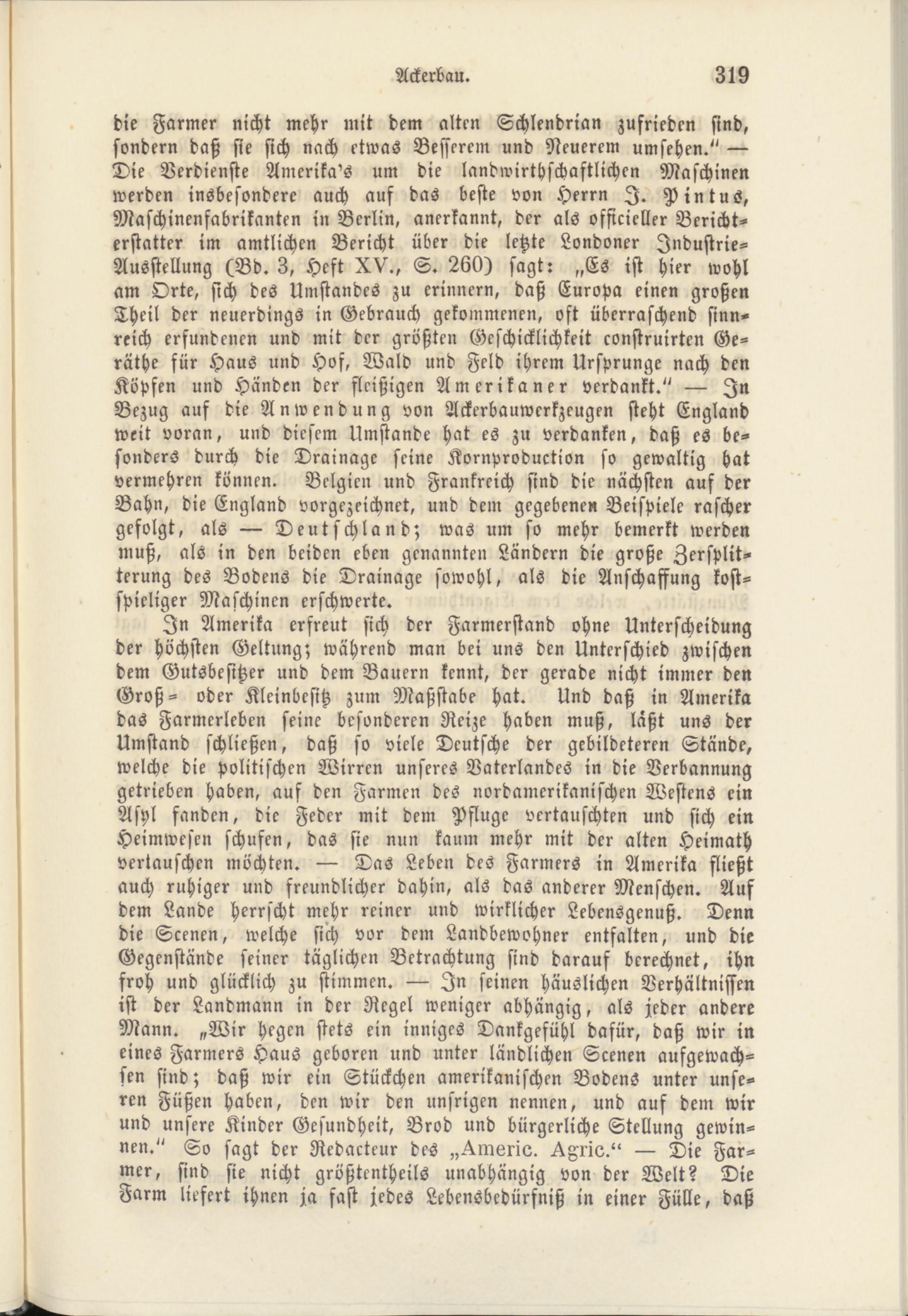 die Farmer nicht mehr mit dem alten Schlendrian zufrieden sind, sondern daß sie sich nach etwas Besserem und Neuerem umsehen." — Die Verdienste Amerika's um die landwirthschaftlichen Maschinen werden insbesondere auch auf das beste von Herrn I. Pintus, Maschinenfabrikanten in Berlin, anerkannt, der als officieller Berichterstatter im amtlichen Bericht über die letzte Londoner Industrie- Ausstellung (Bd. 3, Heft XV., S. 260) sagt: „Es ist hier wohl am Orte, sich des Umstandes zu erinnern, daß Europa einen großen Theil der neuerdings in Gebrauch gekommenen, oft überraschend sinnreich erfundenen und mit der größten Geschicklichkeit construirten Ge- räthe für Haus und Hof, Wald und Feld ihrem Ursprünge nach den Köpfen und Händen der fleißigen Amerikaner verdankt." — In Bezug auf die Anwendung von Ackerbauwerkzeugen steht England weit voran, und diesem Umstände hat es zu verdanken, daß es besonders durch die Drainage seine Kornproduction so gewaltig hat vermehren können. Belgien und Frankreich sind die nächsten auf der Bahn, die England vorgezeichnet, und dem gegebenen Beispiele rascher gefolgt, als — Deutschland; was um so mehr bemerkt werden muß, als in den beiden eben genannten Ländern die große Zersplitterung des Bodens die Drainage sowohl, als die Anschaffung kostspieliger Maschinen erschwerte.