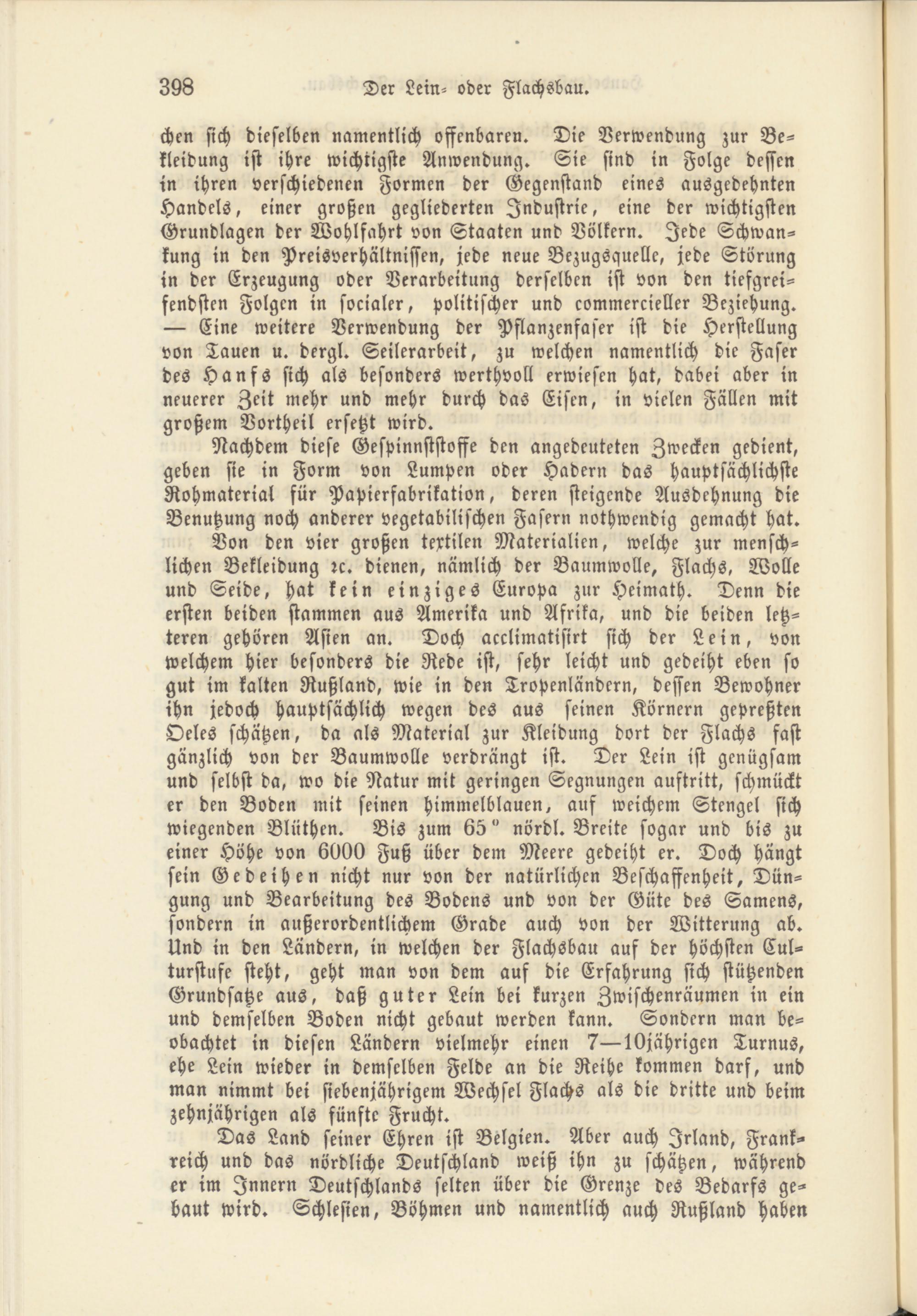 Von den vier großen textilen Materialien, welche zur menschlichen Bekleidung rc. dienen, nämlich der Baumwolle, Flachs, Wolle und Seide, hat kein einziges Europa zur Heimath. Denn die ersten beiden stammen aus Amerika und Afrika, und die beiden letzteren gehören Asien an. Doch acclimatisirt sich der Lein, von welchem hier besonders die Rede ist, sehr leicht und gedeiht eben so gut im kalten Rußland, wie in den Tropenländern, dessen Bewohner ihn jedoch hauptsächlich wegen des aus seinen Körnern gepreßten Oeles schätzen, da als Material zur Kleidung dort der Flachs fast gänzlich von der Baumwolle verdrängt ist. Der Lein ist genügsam und selbst da, wo die Natur mit geringen Segnungen auftritt, schmückt er den Boden mit seinen himmelblauen, auf weichem Stengel sich wiegenden Blüthen. Bis zum 65" nördl. Breite sogar und bis zu einer Höhe von 6000 Fuß über dem Meere gedeiht er. Doch hängt sein Gedeihen nicht nur von der natürlichen Beschaffenheit, Düngung und Bearbeitung des Bodens und von der Güte des Samens, sondern in außerordentlichem Grade auch von der Witterung ab. Und in den Ländern, in welchen der Flachsbau auf der höchsten Culturstufe steht, geht man von dem auf die Erfahrung sich stützenden Grundsätze aus, daß guter Lein bei kurzen Zwischenräumen in ein und demselben Boden nicht gebaut werden kann. Sondern man beobachtet in diesen Ländern vielmehr einen 7—10jährigen Turnus, ehe Lein wieder in demselben Felde an die Reihe kommen darf, und man nimmt bei siebenjährigem Wechsel Flachs als die dritte und beim zehnjährigen als fünfte Frucht.