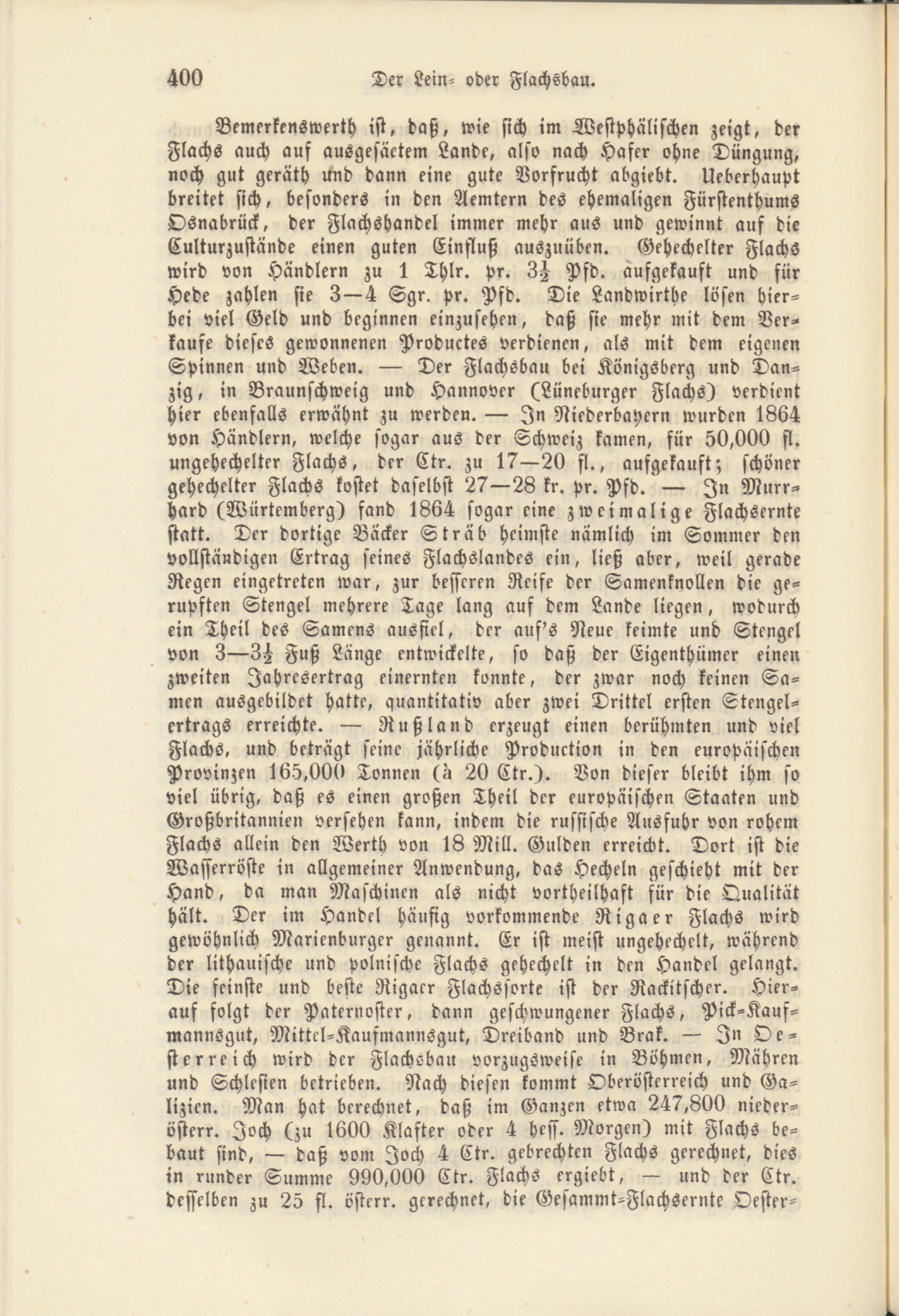 Bemerkenswerth ist, daß, wie sich im Westfälischen zeigt, der Flachs auch auf ausgesäetem Lande, also nach Hafer ohne Düngung, noch gut geräth und dann eine gute Vorfrucht abgiebt. Ueberhaupt breitet sich, besonders in den Aemtern des ehemaligen Fürstenthums Osnabrück, der Flachshandel immer mehr aus und gewinnt auf die Culturzustände einen guten Einfluß auszuüben. Gehechelter Flachs wird von Händlern zu 1 Thlr. pr. 3j Pfd. aufgekauft und für Hede zahlen sie 3—4 Sgr. pr. Pfd. Die Landwirtbe lösen hierbei viel Geld und beginnen einzusehen, daß sie mehr mit dem Verkaufe dieses gewonnenen Produktes verdienen, als mit dem eigenen Spinnen und Weben. — Der Flachsbau bei Königsberg und Dan- zig, in Braunschweig und Hannover (Lüneburger Flachs) verdient hier ebenfalls erwähnt zu werden. — In Niederbayern wurden 1864 von Händlern, welche sogar aus der Schweiz kamen, für 50,000 fl. ungehechelter Flachs, der Ctr. zu 17—20 fl., aufgekauft; schöner gehechelter Flachs kostet daselbst 27—28 kr. pr. Pfd. — In Murr- hard (Würtemberg) fand 1864 sogar eine zweimalige Flachsernte statt. Der dortige Bäcker Sträb heimste nämlich im Sommer den vollständigen Ertrag seines Flachslandes ein, ließ aber, weil gerade Regen eingetreten war, zur besseren Reife der Samenknollen die gerupften Stengel mehrere Tage lang auf dem Lande liegen, wodurch ein Theil des Samens ausfiel, der auf's Neue keimte und Stengel von 3—3^ Fuß Länge entwickelte, so daß der Eigenthümer einen zweiten Jahresertrag einernten konnte, der zwar noch keinen Samen ausgebildet hatte, quantitativ aber zwei Drittel ersten Stengel- ertrags erreichte. — Rußland erzeugt einen berühmten und viel Flachs, und beträgt seine jährliche Produktion in den europäischen Provinzen 165,000 Tonnen (a 20 Ctr.). Von dieser bleibt ihm so viel übrig, daß es einen großen Theil der europäischen Staaten und Großbritannien versehen kann, indem die russische Ausfuhr von rohem Flachs allein den Werth von 18 Mill. Gulden erreicht. Dort ist die Wasserröste in allgemeiner Anwendung, das Hecheln geschieht mit der Hand, da man Maschinen als nicht Vortheilhaft für die Qualität hält. Der im Handel häufig vorkommende Riga er Flachs wird gewöhnlich Marienburger genannt. Er ist meist «»gehechelt, während der lithauische und polnische Flachs gehechelt in den Handel gelangt. Die feinste und beste Rigaer Flachssorte ist der Rackitscher. Hierauf folgt der Paternoster, dann geschwungener Flachs, Pick-Kaufmannsgut, Mittel-Kaufmannsgut, Dreiband und Brak. — In Oesterreich wird der Flachsbau vorzugsweise in Böhmen, Mähren und Schlesien betrieben. Nach diesen kommt Oberösterreich und Ga- lizien. Man hat berechnet, daß im Ganzen etwa 247,800 nieder- österr. Joch (zu 1600 Klafter oder 4 Hess. Morgen) mit Flachs bebaut sind, — daß vom Joch 4 Ctr. gebrachten Flachs gerechnet, dies in runder Summe 990,000 Ctr. Flachs ergiebt, — und der Ctr. desselben zu 25 fl. österr. gerechnet, die Gesammt-Flachsernte Oester-