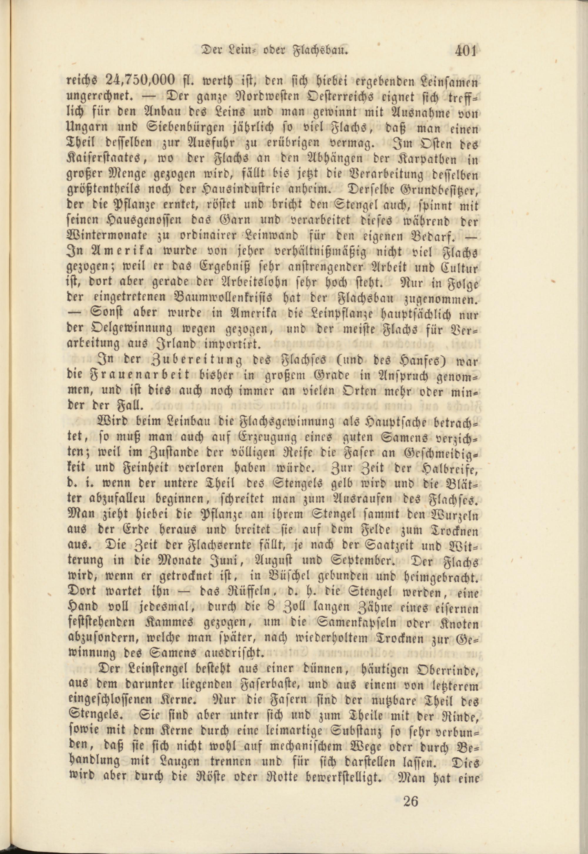 reichs 24,750,000 fl. werth ist, den sich hiebe: ergebenden Leinsamen ungerechnet. — Der ganze Nordwcsten Oesterreichs eignet sich trefflich für den Anbau des Leins und man gewinnt mit Ausnahme von Ungarn und Siebenbürgen jährlich so viel Flachs, daß man einen Theil desselben zur Ausfuhr zu erübrigen vermag. Im Osten des Kaiserstaates, wo der Flachs an den Abhängen der Karpathen in großer Menge gezogen wird, fällt bis jetzt die Verarbeitung desselben größtcntheils noch der Hausindustrie anheim. Derselbe Grundbesitzer, der die Pflanze erntet, röstet und bricht den Stengel auch, spinnt mit seinen Hausgenossen das Garn und verarbeitet dieses während der Wintermonate zu ordinairer Leinwand für den eigenen Bedarf. — In Amerika wurde von jeher verhältnißmäßig nicht viel Flachs gezogen; weil er das Ergebniß sehr anstrengender Arbeit und Cultur ist, dort aber gerade der Arbeitslohn sehr hoch steht. Nur in Folge der eingetretenen Baumwollenkrisis hat der Flachsbau zugenommen. — Sonst aber wurde in Amerika die Leinpflanze hauptsächlich nur der Oelgewinnung wegen gezogen, und der meiste Flachs für Verarbeitung aus Irland importirt.