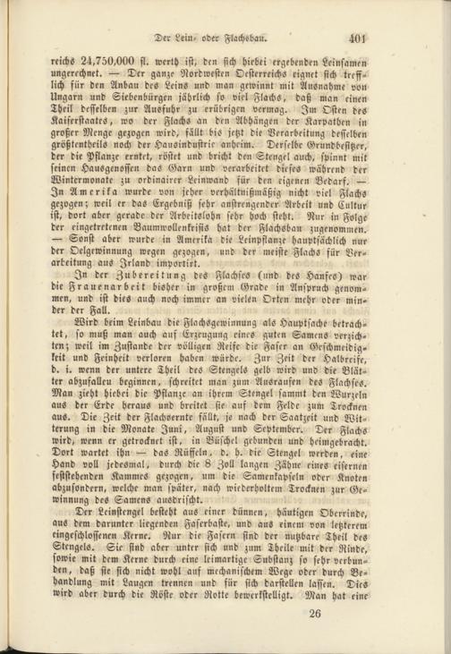 Wird beim Leinbau die Flachsgcwinnung als Hauptsache betrachtet, so muß man auch auf Erzeugung eines guten Samens verzichten; weil im Zustande der völligen Reife die Faser an Geschmeidigkeit und Feinheit verloren haben würde. Zur Zeit der Halbreife, d. i. wenn der untere Theil des Stengels gelb wird und die Blätter abzufallen beginnen, schreitet man zum Ausraufen des Flachses. Man zieht Hiebei die Pflanze an ihrem Stengel sammt den Wurzeln aus der Erde heraus und breitet sie auf dem Felde zum Trocknen aus. Die Zeit der Flachsernte fällt, je nach der Saatzeit und Witterung in die Monate Juni, August und September. Der Flachs wird, wenn er getrocknet ist, in Büschel gebunden und heimgebracht. Dort wartet ihn — das Rüffeln, d. h. die Stengel werden, eine Hand voll jedesmal, durch die 8 Zoll langen Zähne eines eisernen feststehenden Kammes gezogen, um die Samenkapseln oder Knoten abzusondern, welche man später, nach wiederholtem Trocknen zur Gewinnung des Samens ausdrischt.