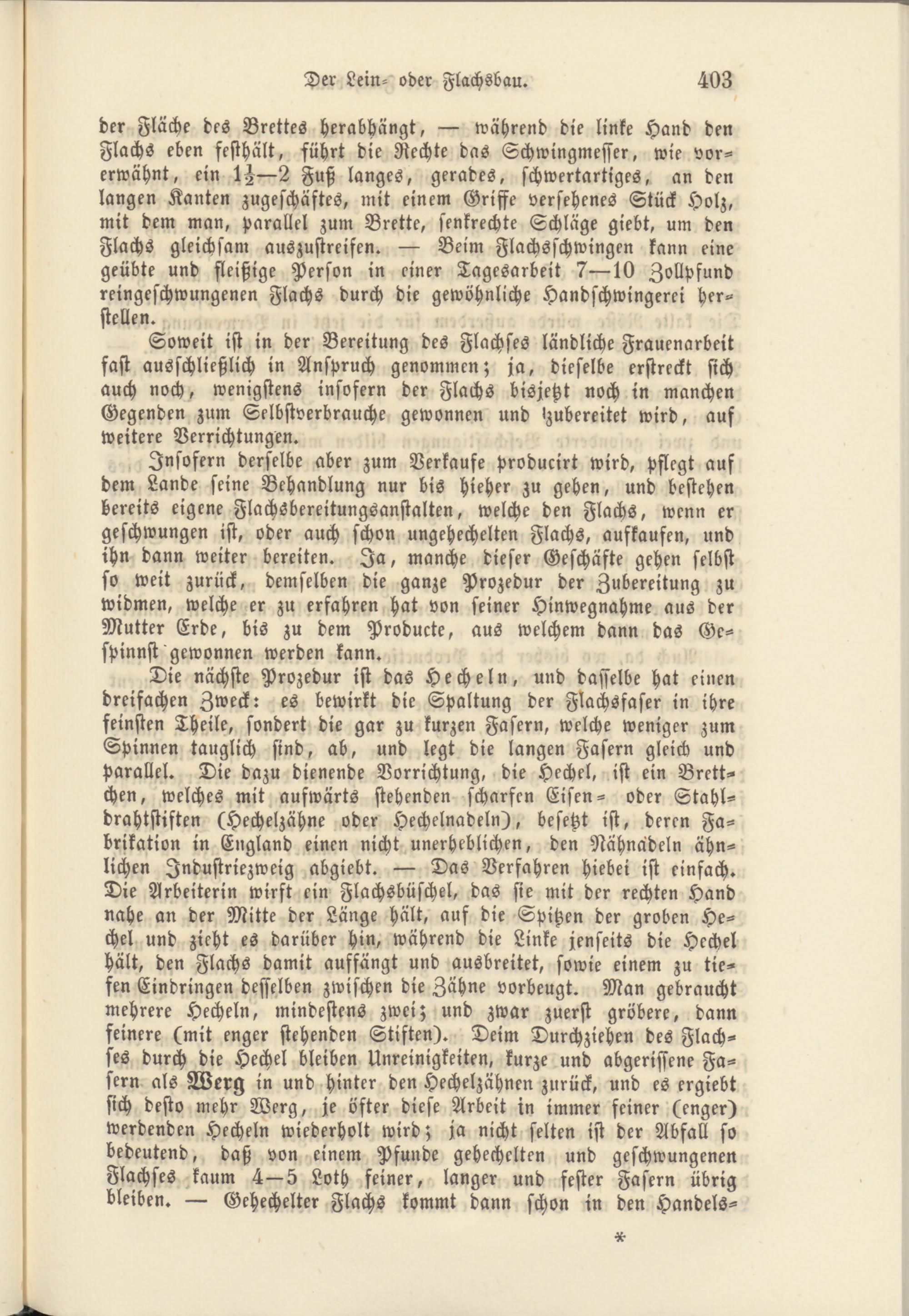 Soweit ist in der Bereitung des Flachses ländliche Frauenarbeit fast ausschließlich in Anspruch genommen; ja, dieselbe erstreckt sich auch noch, wenigstens insofern der Flachs bisjetzt noch in manchen Gegenden zum Selbstverbrauche gewonnen und »zubereitet wird, auf weitere Verrichtungen.