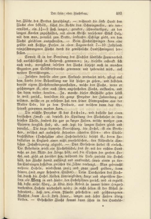 Insofern derselbe aber zum Verkaufe producirt wird, Pflegt auf dem Lande seine Behandlung nur bis hieher zu gehen, und bestehen bereits eigene Flachsbereitungsanstalten, welche den Flachs, wenn er geschwungen ist, oder auch schon ««gehechelten Flachs, aufkaufen, und ihn dann weiter bereiten. Ja, manche dieser Geschäfte gehen selbst so weit zurück, demselben die ganze Prozedur der Zubereitung zu widmen, welche er zu erfahren hat von seiner Hinwegnahme aus der Mutter Erde, bis zu dem Produkte, aus welchem dann das Gewinnst gewonnen werden kann.