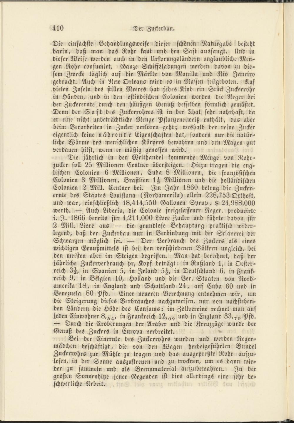 Die jährlich in den Welthandel kommende Menge von Rohrzucker soll 25 Millionen Centner übersteigen. Hiezu tragen die englischen Colonien 6 Millionen, Cuba 8 Millionen, die französischen Colonien 3 Millionen, Brasilien 1H Millionen und die holländischen Colonien 2 Mill. Centner bei. Im Jahr 1860 betrug die Zuckerernte des Staates Louisiana (Nordamerika) allein 226,753 Oxthoft, und war, einschließlich 18,414,550 Gallonen Syrup, K 24,988,000 werth. — Auch Liberia, die Colonie freigelassener Neger, producirte i. I. 1866 bereits für 4,211,000 Livre Zucker und führte davon für 2 Mill. Livre aus — die grundlose Behauptung praktisch widerlegend, daß der Zuckerbau nur in Verbindung mit der Sklaverei der Schwarzen möglich sei. — Der Verbrauch des Zuckers als eines wichtigen Genußmittels ist bei den verschiedenen Völkern ungleich, bei den meisten aber im Steigen begriffen. Man hat berechnet, daß der jährliche Zuckerverbrauch pr, Kopf beträgt: in Rußland 1, in Oesterreich 3j, in Spanien 5, in Irland 5^, in Deutschland 6 , in Frankreich 9, in Belgien 10, Holland und die Ver. Staaten von Nordamerika 18, in England und Schottland 24, auf Cuba 60 und in Venezuela 80 Pfd. Einer neueren Berechnung entnehmen wir, um die Steigerung dieses Verbrauches nachzuweisen, nur von nachstehenden Ländern die Höhe des Consums: im Zollvereine rechnet man auf jeden Einwohner 6 , 54 , in Frankreich 12,und in England 33,Pfd. — Durch die Eroberungen der Araber und die Kreuzzüge wurde der Genuß des Zuckers in Europa verbreitet.
