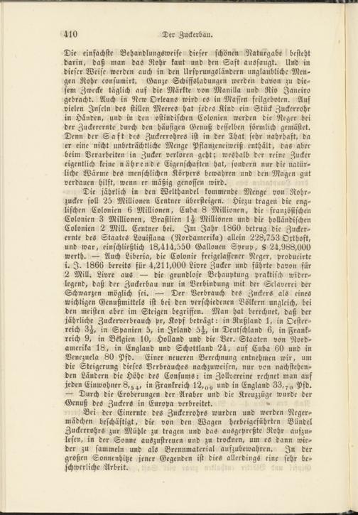 Die einfachste Behandlungsweise dieser schönen Naturgabe besteht darin, daß man das Rohr kaut und den Saft aussaugt. Und in dieser Weise werden auch in den Ursprungsländern unglaubliche Mengen Rohr consumirt. Ganze Schiffsladungen werden davon zu diesem Zwecke täglich auf die Märkte von Manilla und Rio Janeiro gebracht. Auch in New Orleans wird es in Massen feilgeboten. Auf vielen Inseln des stillen Meeres hat jedes Kind ein Stück Zuckerrohr in Händen, und in den ostindischen Colonien werden die Neger bei der Zuckerernte durch den häufigen Genuß desselben förmlich gemästet. Denn der Saft des Zuckerrohres ist in der That sehr nahrhaft, da er eine nicht unbeträchtliche Menge Pflanzeneiweiß enthält, das aber beim Verarbeiten in Zucker verloren geht; weshalb der reine Zucker eigentlich keine nährende Eigenschaften hat, sondern nur die natürliche Wärme des menschlichen Körpers bewahren und den Magen gut verdauen hilft, wenn er mäßig genossen wird.