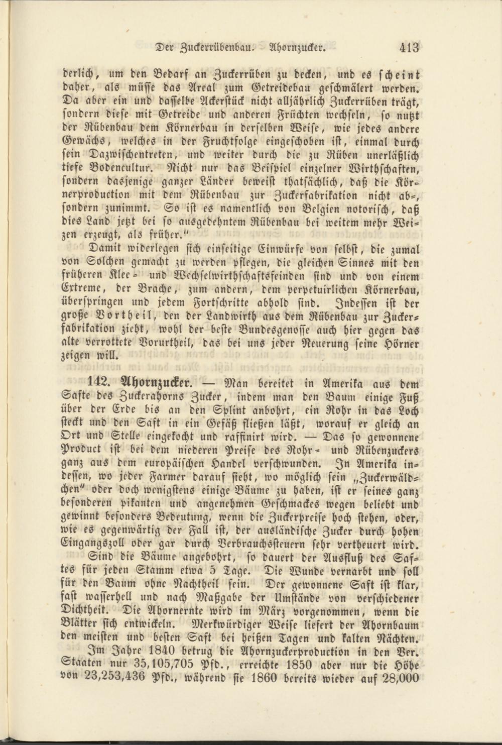 142. Ahornzucker. — Man bereitet in Amerika aus dem Safte des Zuckerahornö Zucker, indem man den Baum einige Fuß über der Erde bis an den Splint anbohrt, ein Rohr in das Loch steckt und den Saft in ein Gefäß fließen läßt, worauf er gleich an Ort und Stelle eingekocht und raffinirt wird. — Das so gewonnene Product ist bei dem niederen Preise des Rohr- und Rübenzuckers ganz aus dem europäischen Handel verschwunden. In Amerika indessen, wo jeder Farmer darauf sieht, wo möglich sein „Zuckerwäldchen" oder doch wenigstens einige Bäume zu haben, ist er seines ganz besonderen pikanten und angenehmen Geschmackes wegen beliebt und gewinnt besonders Bedeutung, wenn die Zuckerpreise hoch stehen, oder, wie es gegenwärtig der Fall ist, der ausländische Zucker durch hohen Eingangszoll oder gar durch Verbrauchssteuern sehr vertheucrt wird.