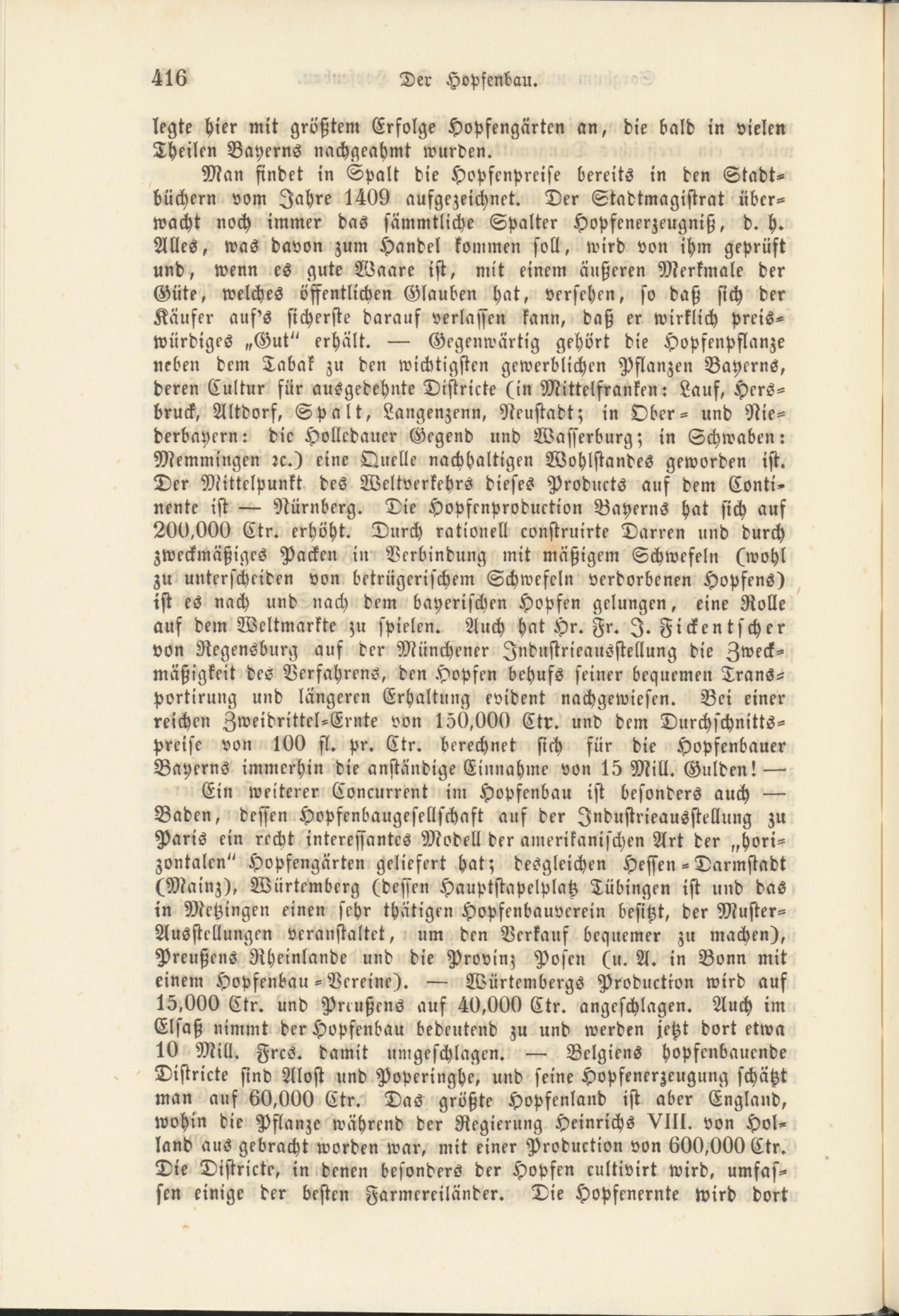 Man findet in Spalt die Hopfenpreise bereits in den Stadtbüchern vom Jahre 1409 aufgezeichnet. Der Stadtmagistrat überwacht noch immer das sämmtliche Spalter Hopfenerzeugniß, d. h. Alles, was davon zum Handel kommen soll, wird von ihm geprüft und, wenn es gute Waare ist, mit einem äußeren Merkmale der Güte, welches öffentlichen Glauben hat, versehen, so daß sich der Käufer aus's sicherste darauf verlassen kann, daß er wirklich preis- würdiges „Gut" erhält. — Gegenwärtig gehört die Hopfenpflanze neben dem Tabak zu den wichtigsten gewerblichen Pflanzen Bayerns, deren Cultur für ausgedehnte Distrikte (in Mittelfranken: Lauf, Hersbruck, Altdorf, Spalt, Langenzenn, Neustadt; in Ober- und Nie- derbayern: die Holledauer Gegend und Wasserburg; in Schwaben: Memmingen rc.) eine Quelle nachhaltigen Wohlstandes geworden ist. Der Mittelpunkt des Weltverkehrs dieses Products auf dem Conti- nente ist — Nürnberg. Die Hopfenproduction Bayerns hat sich auf 200,000 Ctr. erhöht. Durch rationell construirte Darren und durch zweckmäßiges Packen in Verbindung mit mäßigem Schwefeln (wohl zu unterscheiden von betrügerischem Schwefeln verdorbenen Hopfens) ist es nach und nach dem bayerischen Hopfen gelungen, eine Rolle auf dem Weltmärkte zu spielen. Auch hat Hr. Fr. I. Ficken tscher von Negensburg auf der Münchener Industrieausstellung die Zweckmäßigkeit des Verfahrens, den Hopsen behufs seiner bequemen Trans- portirung und längeren Erhaltung evident nachgewiesen. Bei einer reichen Zweidrittel-Ernte von 150,000 Ctr. und dem Durchschnittspreise von 100 fl. pr. Ctr. berechnet sich für die Hopfenbauer Bayerns immerhin die anständige Einnahme von 15 Mill. Gulden! —