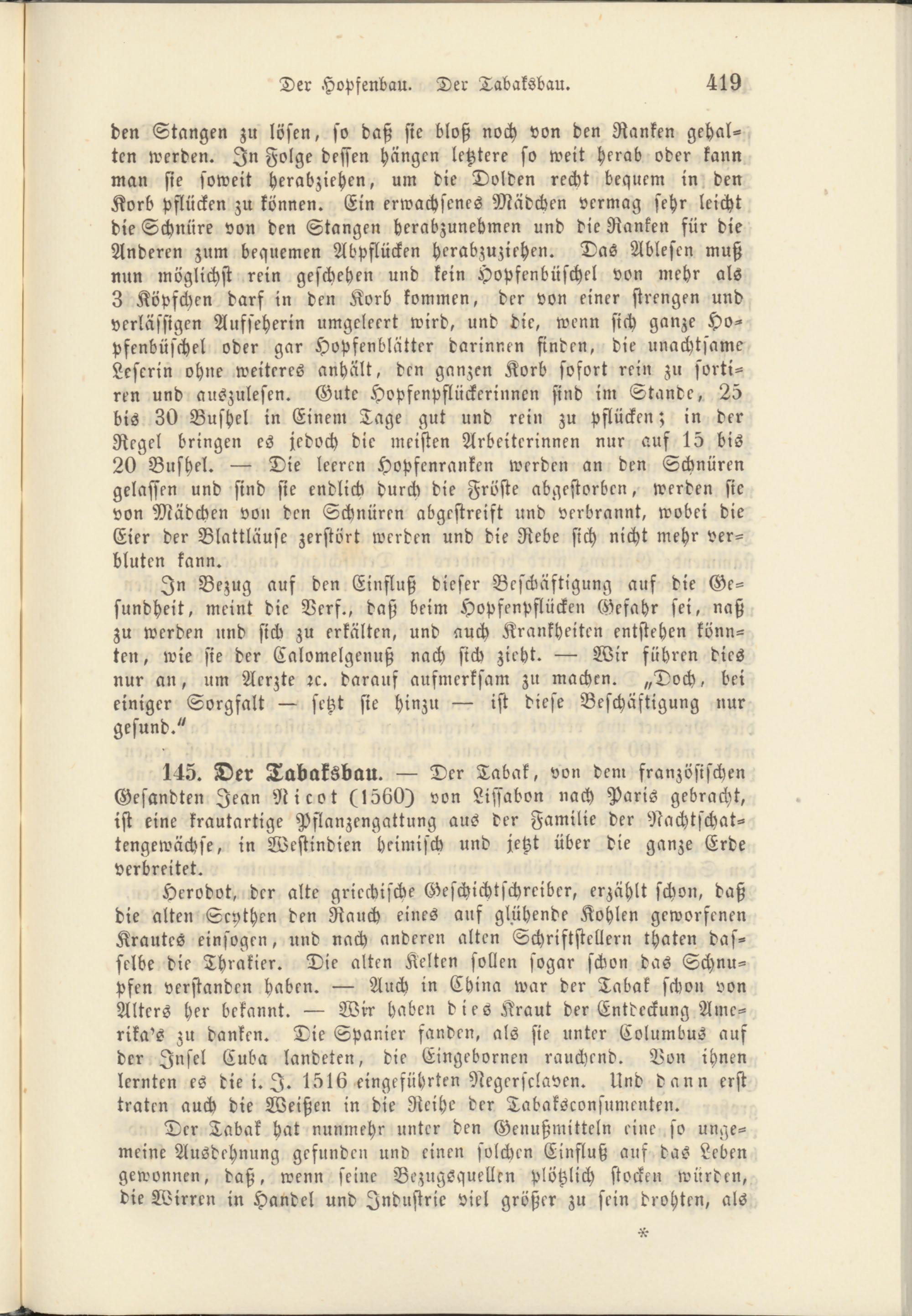 145. Der Tabaksbau. — Der Tabak, von dem französischen Gesandten Jean Nicot (1560) von Lissabon nach Paris gebracht, ist eine krautartige Pflanzengattung aus der Familie der Nachtschattengewächse, in Westindien heimisch und jetzt über die ganze Erde verbreitet.