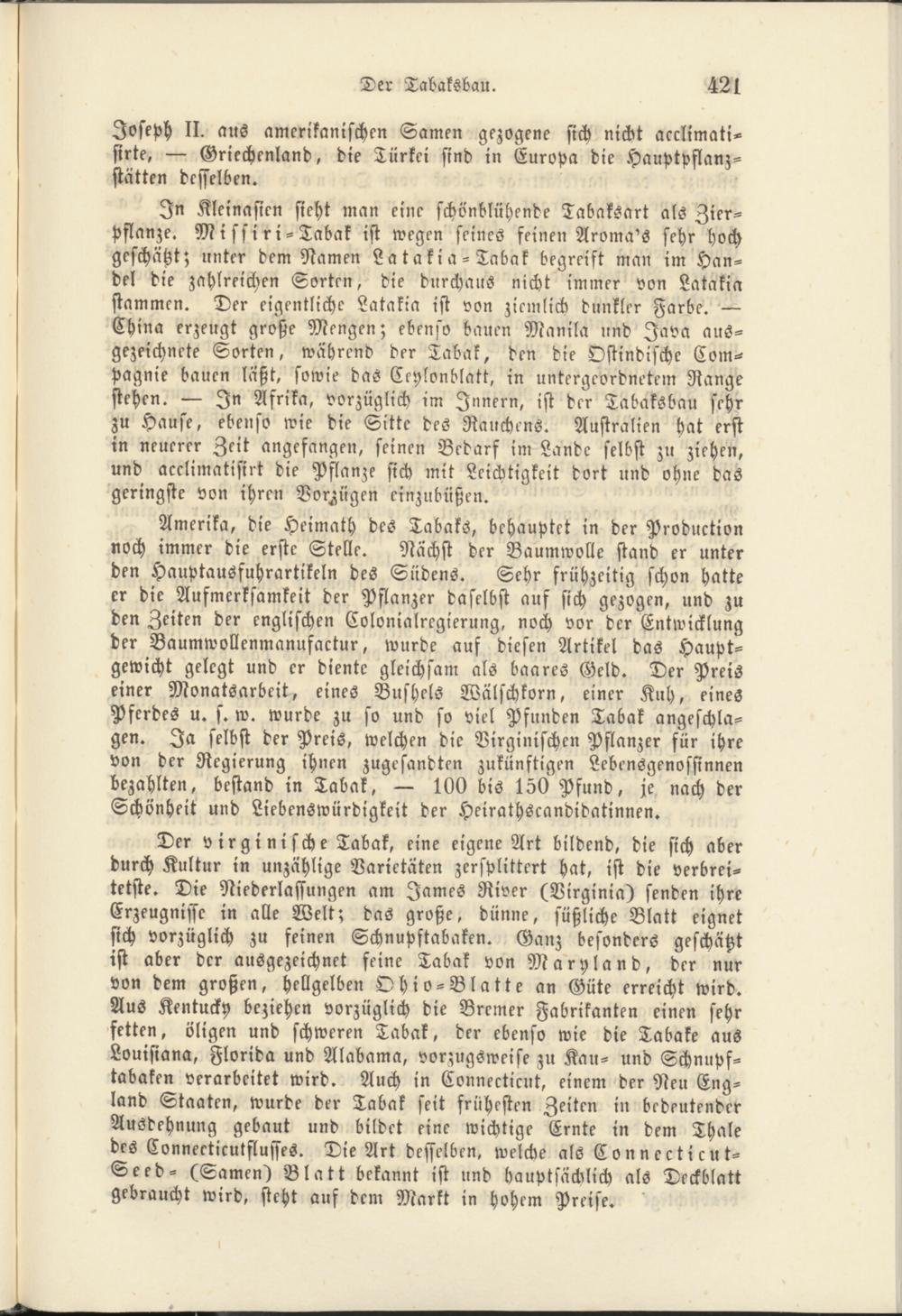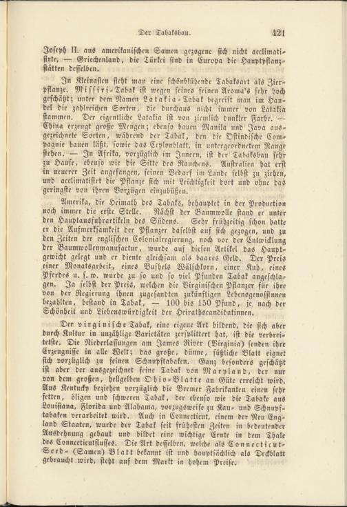Der v irgi ni sche Tabak, eine eigene Art bildend, die sich aber durch Kultur in unzählige Varietäten zersplittert hat, ist die verbrei- tetste. Die Niederlassungen am James River (Virginia) senden ihre Erzeugnisse in alle Welt; das große, dünne, süßliche Blatt eignet sich vorzüglich zu feinen Schnupftabaken. Ganz besonders geschätzt ist aber der ausgezeichnet feine Tabak von Maryland, der nur von dem großen, hellgelben Ohio-Blatte an Güte erreicht wird. Aus Kentucky beziehen vorzüglich die Bremer Fabrikanten einen sehr fetten, öligen und schweren Tabak, der ebenso wie die Tabake aus Louisiana, Florida und Alabama, vorzugsweise zu Kau- und Schnupftabaken verarbeitet wird. Auch in Connecticut, einem der Neu England Staaten, wurde der Tabak seit frühesten Zeiten in bedeutender Ausdehnung gebaut und bildet eine wichtige Ernte in dem Thale des Conneeticutflusses. Die Art desselben, welche als Connecticut- Seed- (Samen) Blatt bekannt ist und hauptsächlich als Deckblatt gebraucht wird, steht auf dem Markt in hohem Preise.