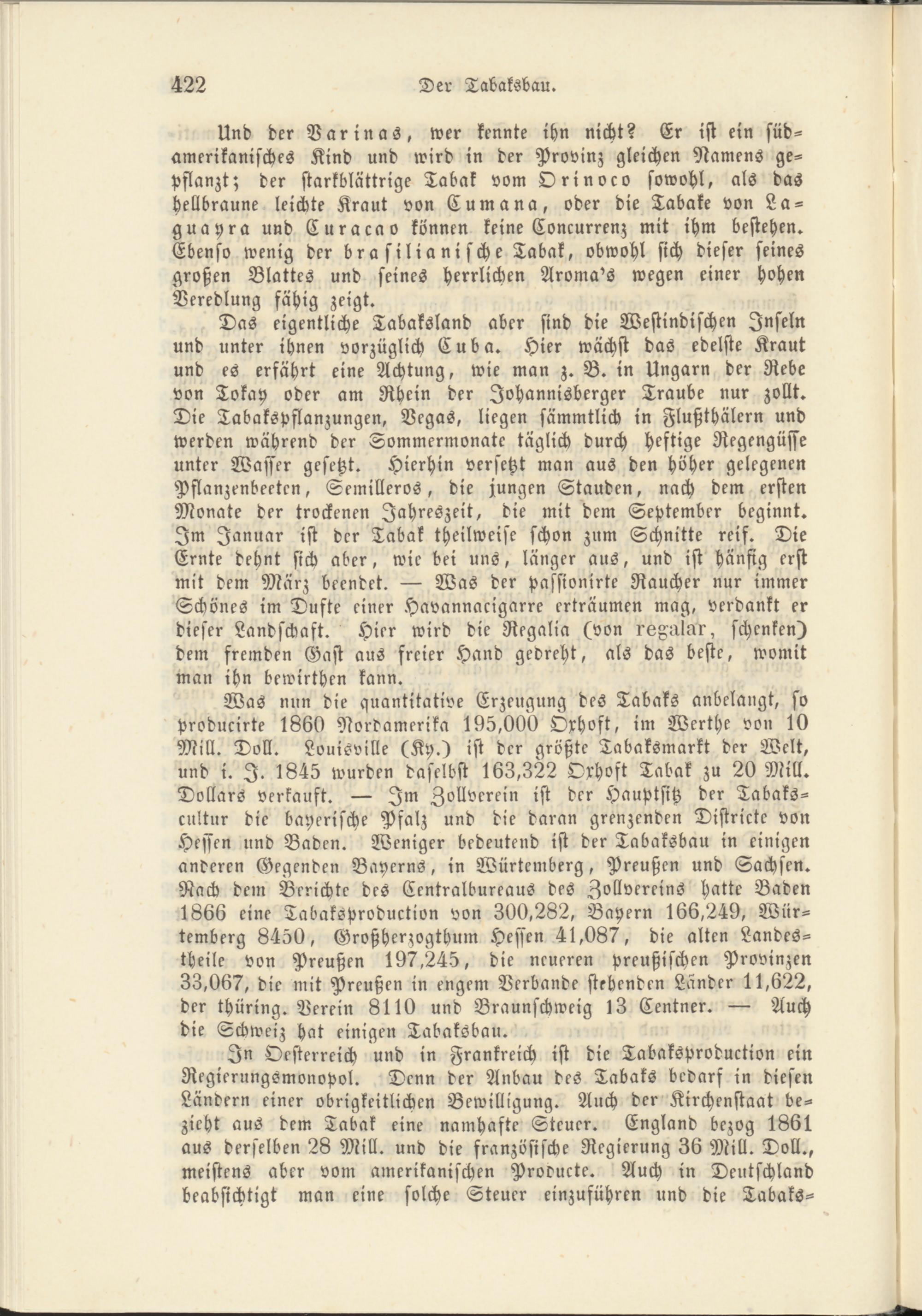 Und der Varinas, wer kennte ihn nicht? Er ist ein süd- amerikanisches Kind und wird in der Provinz gleichen Namens gepflanzt; der starkblättrige Tabak vom Orinoco sowohl, als das hellbraune leichte Kraut von Cumana, oder die Tabake von Lagern yra und Curacao können keine Concurrenz mit ihm bestehen. Ebenso wenig der brasilianische Tabak, obwohl sich dieser seines großen Blattes und seines herrlichen Aroma's wegen einer hohen Veredlung fähig zeigt.
