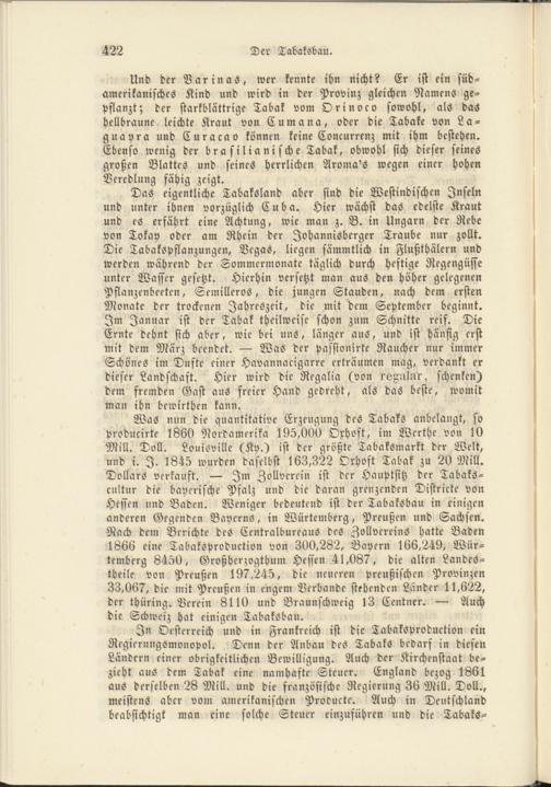 In Oesterreich und in Frankreich ist die Tabaksproduction ein Regierungsmonopol. Denn der Anbau des Tabaks bedarf in diesen Ländern einer obrigkeitlichen Bewilligung. Auch der Kirchenstaat bezieht aus dem Tabak eine namhafte Steuer. England bezog 1861 aus derselben 28 Mill. und die französische Regierung 36 Mill. Doll., meistens aber vom amerikanischen Produkte. Auch in Deutschland beabsichtigt man eine solche Steuer einzuführen und die Tabaks-