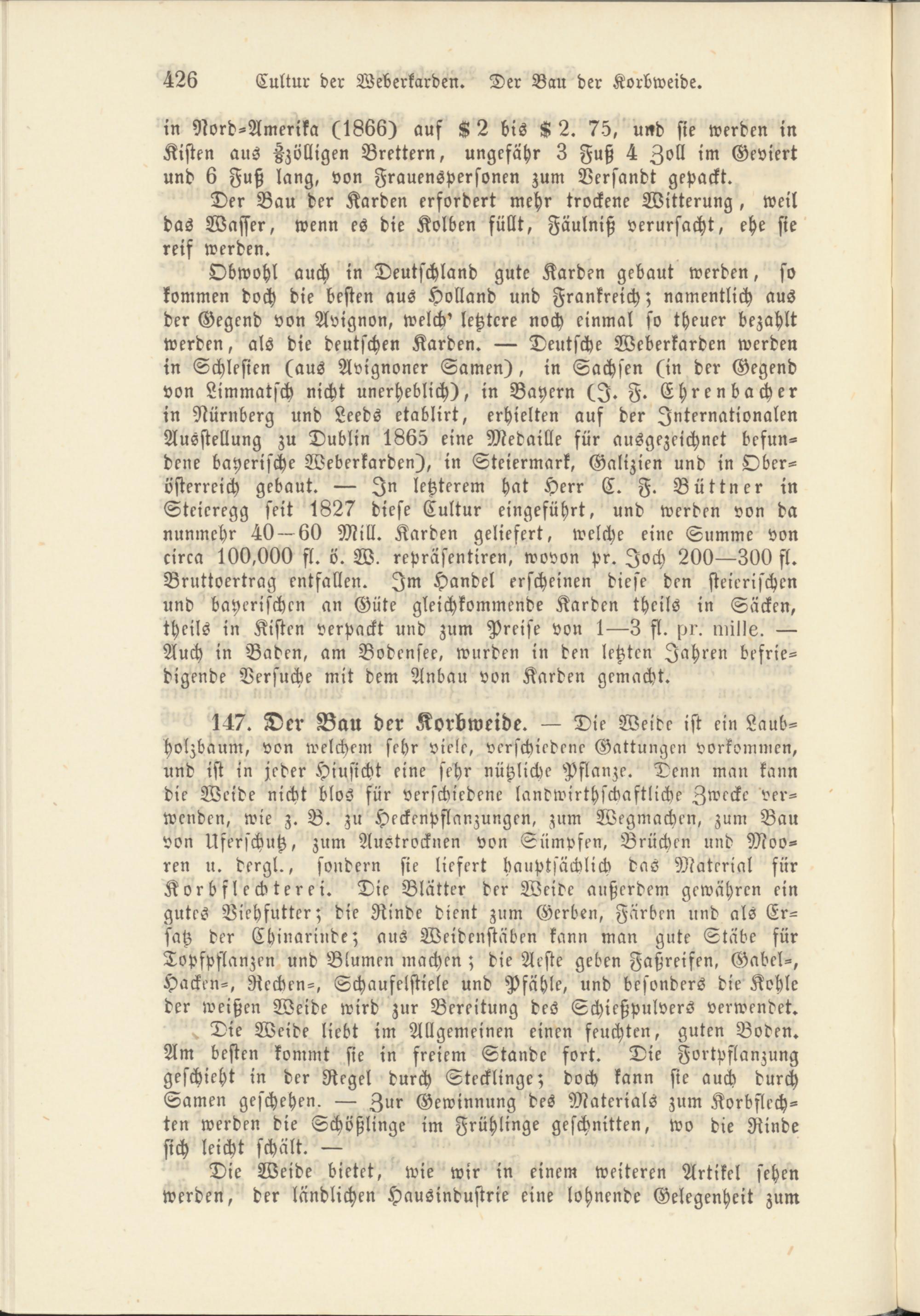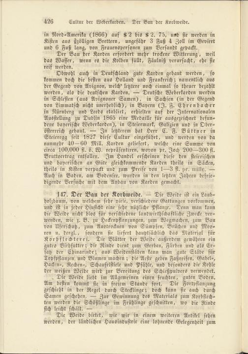 Obwohl auch in Deutschland gute Karden gebaut werden, so kommen doch die besten aus Holland und Frankreich; namentlich aus der Gegend von Avignon, welch' letztere noch einmal so theuer bezahlt werden, als die deutschen Karden. — Deutsche Weberkarden werden in Schlesien (aus Avignoner Samen), in Sachsen (in der Gegend von Limmatsch nicht unerheblich), in Bayern (I. F. Ehrenbücher in Nürnberg und Leeds etablirt, erhielten auf der Internationalen Ausstellung zu Dublin 1865 eine Medaille für ausgezeichnet befundene bayerische Weberkarden), in Steiermark, Galizien und in Oberösterreich gebaut. — Zn letzterem hat Herr C. F. Büttner in Steicregg seit 1827 diese Cultur eingeführt, und werden von da nunmehr 40 — 60 Mill. Karden geliefert, welche eine Summe von circa 100,000 st. ö. W. repräsentiern, wovon pr. Joch 200—300 st. Bruttoertrag entfallen. Im Handel erscheinen diese den steierischen und bayerischen an Güte gleichkommende Karden theils in Säcken, theils in Kisten verpackt und zum Preise von 1—3 st. pr. mille. — Auch in Baden, am Bodensee, wurden in den letzten Jahren befriedigende Versuche mit dem Anbau von Karden gemacht.
