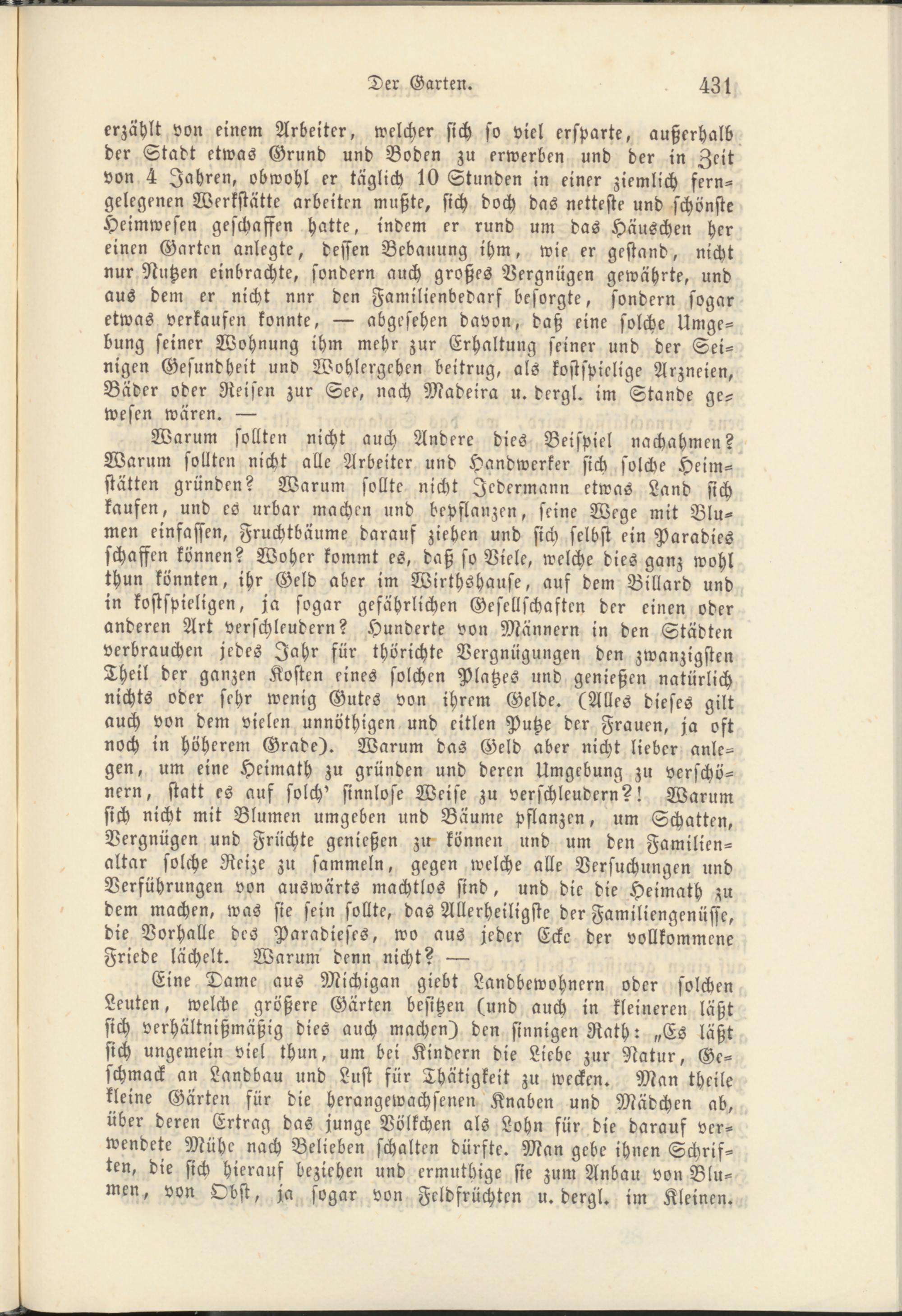 Warum sollten nicht auch Andere dies Beispiel nachahmen? Warum sollten nicht alle Arbeiter und Handwerker sich solche Heimstätten gründen? Warum sollte nicht Jedermann etwas Land sich kaufen, und es urbar machen und bepflanzen, seine Wege mit Blumen einfassen, Fruchtbäume darauf ziehen und sich selbst ein Paradies schaffen können? Woher kommt es, daß so Viele, welche dies ganz wohl thun könnten, ihr Geld aber im Wirthshause, auf dem Billard und in kostspieligen, ja sogar gefährlichen Gesellschaften der einen oder anderen Art verschleudern? Hunderte von Männern in den Städten verbrauchen jedes Jahr für thörichte Vergnügungen den zwanzigsten Theil der ganzen Kosten eines solchen Platzes und genießen natürlich nichts oder sehr wenig Gutes von ihrem Gelde. (Alles dieses gilt auch von dem vielen unnöthigen und eitlen Putze der Frauen, ja oft noch in höherem Grade). Warum das Geld aber nicht lieber anlegen, um eine Heimath zu gründen und deren Umgebung zu verschönern, statt es auf solch' sinnlose Weise zu verschleudern?! Warum sich nicht mit Blumen umgeben und Bäume pflanzen, um Schatten, Vergnügen und Früchte genießen zu können und um den Familien- altar solche Reize zu sammeln, gegen welche alle Versuchungen und Verführungen von auswärts machtlos sind, und die die Heimath zu dem machen, was sie sein sollte, das Allerheiligste der Familiengenüsse, die Vorhalle des Paradieses, wo aus jeder Ecke der vollkommene Friede lächelt. Warum denn nicht? —