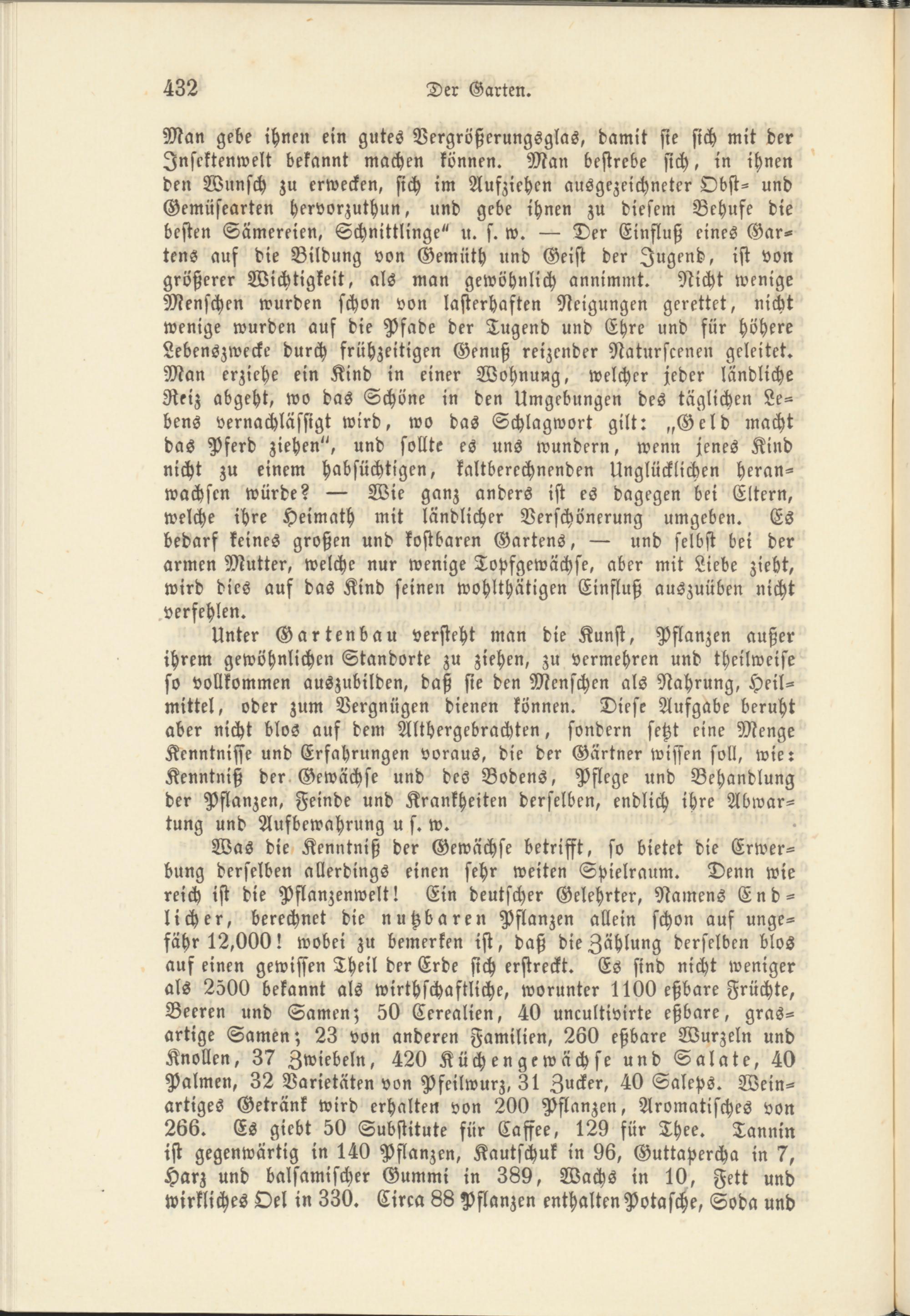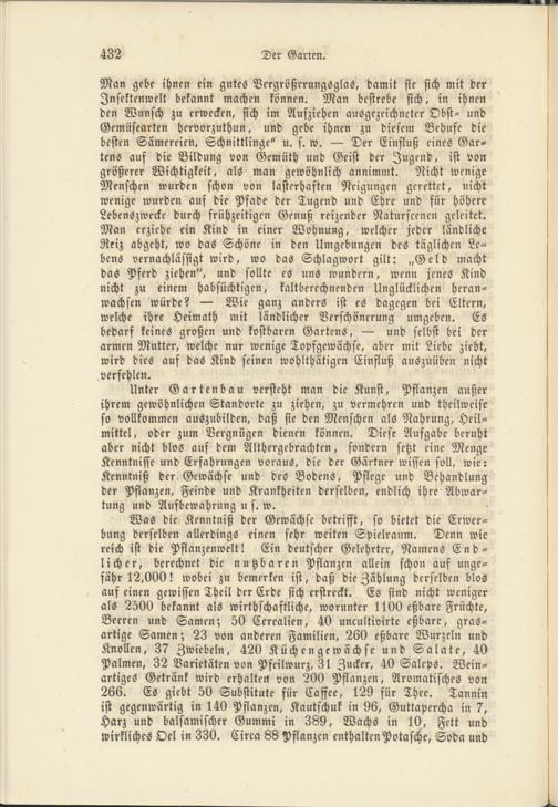 Was die Kenntniß der Gewächse betrifft, so bietet die Erwerbung derselben allerdings einen sehr weiten Spielraum. Denn wie reich ist die Pflanzenwelt! Ein deutscher Gelehrter, Namens Endlicher, berechnet die nutzbaren Pflanzen allein schon auf ungefähr 12,000! wobei zu bemerken ist, daß die Zählung derselben blos auf einen gewissen Theil der Erde sich erstreckt. Es sind nicht weniger als 2500 bekannt als wirthschaftliche, worunter 1100 eßbare Früchte, Beeren und Samen; 50 Cerealien, 40 uncultivirte eßbare, grasartige Samen; 23 von anderen Familien, 260 eßbare Wurzeln und Knollen, 37 Zwiebeln, 420 Küchengewächse und Salate, 40 Palmen, 32 Varietäten von Pfeilwurz, 31 Zucker, 40 Saleps. Wein- artiges Getränk wird erhalten von 200 Pflanzen, Aromatisches von 266. Es giebt 50 Substitute für Caffee, 129 für Thee. Tannin ist gegenwärtig in 140 Pflanzen, Kautschuk in 96, Guttapercha in 7, Harz und balsamischer Gummi in 389, Wachs in 10, Fett und wirkliches Oel in 330. Circa 88 Pflanzen enthalten Potasche, Soda und