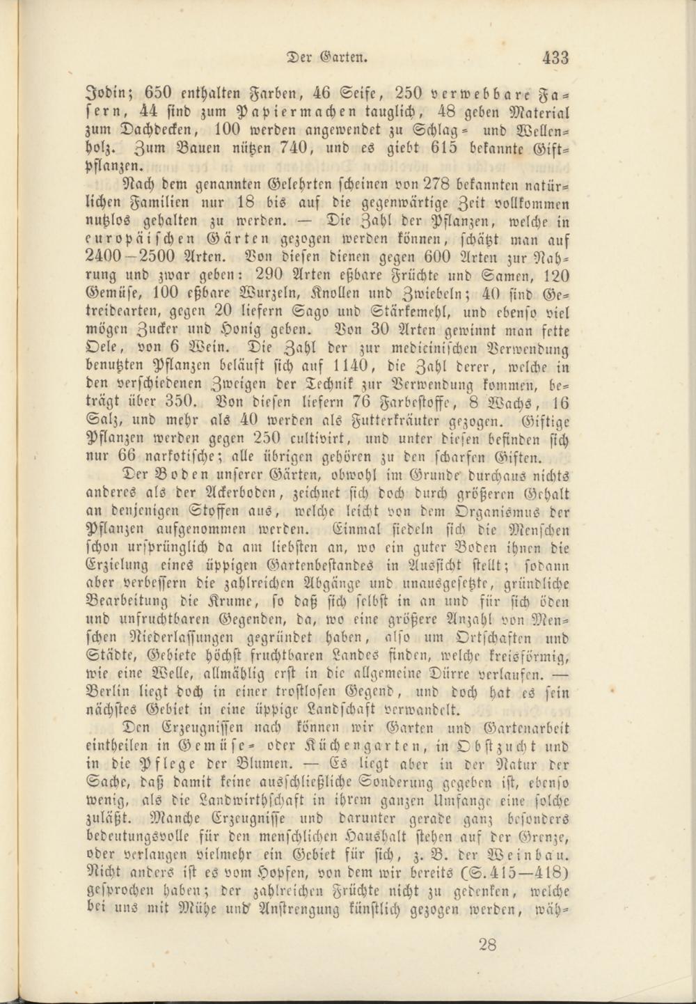 Den Erzeugnissen nach können wir Garten und Gartenarbeit eintheilen in Gemüse- oder Küchen garten, in Obstzucht und in die Pflege der Blumen. — Es liegt aber in der Natur der Sache, daß damit keine ausschließliche Sonderuug gegeben ist, ebenso wenig, als die Landwirtschaft in ihrem ganzen Umfange eine solche zuläßt. Manche Erzeugnisse und darunter gerade ganz besonders bedeutungsvolle für den menschlichen Haushalt stehen auf der Grenze, oder verlangen vielmehr ein Gebiet für sich, z. B. der Weinbau. Nicht anders ist es vom Hopfen, von dem wir bereits (S.415—418) gesprochen haben; der zahlreichen Früchte nicht zu gedenken, welche bei uns mit Mühe und' Anstrengung künstlich gezogen werden, wäh-
