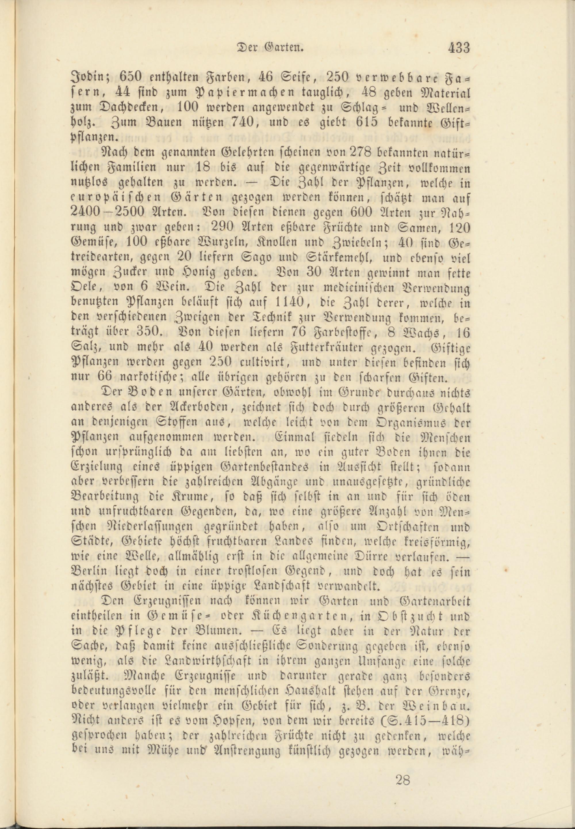 Der Boden unserer Gärten, obwohl im Grunde durchaus nichts anderes als der Ackerboden, zeichnet sich dock durch größeren Gehalt an denjenigen Stoffen aus, welche leicht von dem Organismus der Pflanzen aufgenommen werden. Einmal siedeln sich die Menschen schon ursprünglich da am liebsten an, wo ein guter Boden ihnen die Erzielung eines üppigen Gartenbestandes in Aussicht stellt; sodann aber verbessern die zahlreichen Abgänge und unausgesetzte, gründliche Bearbeitung die Krume, so daß sich selbst in an und für sich öden und unfruchtbaren Gegenden, da, wo eine größere Anzahl von Menschen Niederlassungen gegründet haben, also um Ortschaften und Städte, Gebiete höchst fruchtbaren Landes finden, welche kreisförmig, wie eine Welle, allmählig erst in die allgemeine Dürre verlausen. — Berlin liegt doch in einer trostlosen Gegend, und doch hat es sein nächstes Gebiet in eine üppige Landschaft verwandelt.