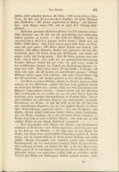 Nach dem genannten Gelehrten scheinen von 278 bekannten natürlichen Familien nur 18 bis aus die gegenwärtige Zeit vollkommen nutzlos gehalten zu werden. — Die Zahl der Pflanzen, welche in europäischen Gärten gezogen werden können, schätzt man auf 2400—2500 Arten. Von diesen dienen gegen 600 Arten zur Nahrung und zwar geben: 290 Arten eßbare Früchte und Samen, 120 Gemüse, 100 eßbare Wurzeln, Knollen und Zwiebeln; 40 sind Getreidearten, gegen 20 liefern Sago und Stärkemehl, und ebenso viel mögen Zucker und Honig geben. Von 30 Arten gewinnt man fette Oele, von 6 Wein. Die Zahl der zur medicinischen Verwendung benutzten Pflanzen bcläuft sich auf 1140, die Zahl derer, welche in den verschiedenen Zweigen der Technik zur Verwendung kommen, beträgt über 350. Von diesen liefern 76 Farbestoffe, 8 Wachs, 16 Salz, und mehr als 40 werden als Futterkräuter gezogen. Giftige Pflanzen werden gegen 250 cultivirt, und unter diesen befinden sich nur 66 narkotische; alle übrigen gehören zu den scharfen Giften.