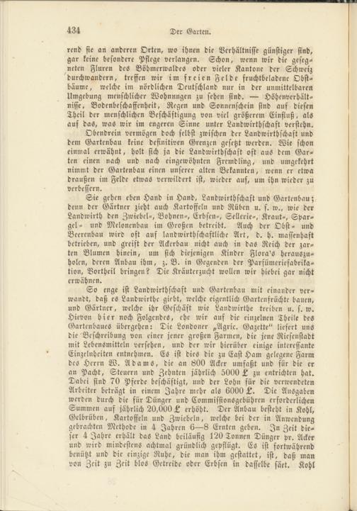 So enge ist Landwirthschaft und Gartenbau mit einander verwandt, daß es Landwirthe giebt, welche eigentlich Gartenfrüchtc bauen, und Gärtner, welche ihr Geschäft wie Landwirthe treiben u. s. w. Hievon hier noch Folgendes, ehe wir auf die einzelnen Theile des Gartenbaues übergehen: Die Londoner „Agric. Gazette" liefert uns die'Beschreibung von einer jener großen Farmen, die jene Riesenstadt mit Lebensmitteln versehen, und der wir hierüber einige interessante Einzelnheiten entnehmen. Es ist dies die zu East Hain gelegene Farm des Herrn W. Adams, die an 600 Acker umfaßt und für die er an Pacht, Steuern und Zehnten jährlich 5000^ zu entrichten hat. Dabei sind 70 Pferde beschäftigt, und der Lohn für die verwendeten Arbeiter beträgt in einem Jahre mehr als 6000 L. Die Ausgaben werden durch die für Dünger und Commissionsgebühren erforderlichen Summen auf jährlich 20,000 L erhöht. Der Anbau besteht in Kohl, Gelbrüben, Kartoffeln und Zwiebeln, welche bei der in Anwendung gebrachten Methode in 4 Jahren 6—8 Ernten geben. In Zeit dieser 4 Jahre erhält das Land beiläufig 120 Tonnen Dünger pr. Acker und wird mindestens achtmal gründlich gepflügt. Es ist fortwährend benutzt und die einzige Ruhe, die man ihm gestattet, ist, daß man von Zeit zu Zeit blos Getreide oder Erbsen in dasselbe säet. Kohl