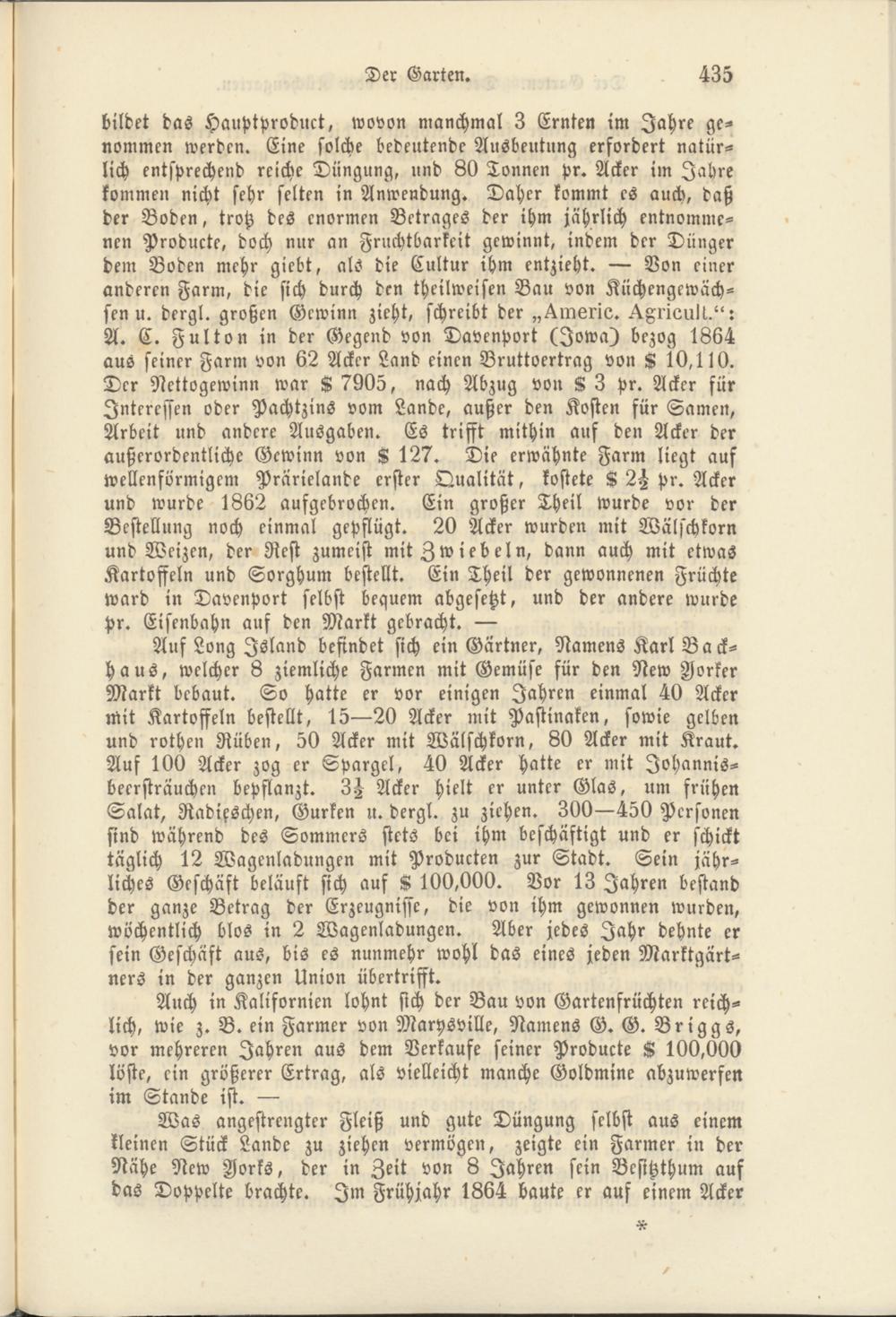 Auf Long Island befindet sich ein Gärtner, Namens Karl Backhaus, welcher 8 ziemliche Farmen mit Gemüse für den New Aorker Markt bebaut. So hatte er vor einigen Jahren einmal 40 Acker Mit Kartoffeln bestellt, 15—20 Acker mit Pastinaken, sowie gelben und rothen Rüben, 50 Acker mit Wälschkorn, 80 Acker mit Kraut. Auf 100 Acker zog er Spargel, 40 Acker hatte er mit Johannis- beerstrauchen bepflanzt. 3^ Acker hielt er unter Glas, um frühen Salat, Radieschen, Gurken u. dergl. zu ziehen. 300—450 Personen sind während des Sommers stets bei ihm beschäftigt und er schickt täglich 12 Wagenladungen mit Produkten zur Stadt. Sein jährliches Geschäft beläuft sich auf K 100,000. Vor 13 Jahren bestand der ganze Betrag der Erzeugnisse, die von ihm gewonnen wurden, wöchentlich blos in 2 Wagenladungen. Aber jedes Jahr dehnte er sein Geschäft aus, bis es nunmehr wohl das eines jeden Marktgärtners in der ganzen Union übertrifft.