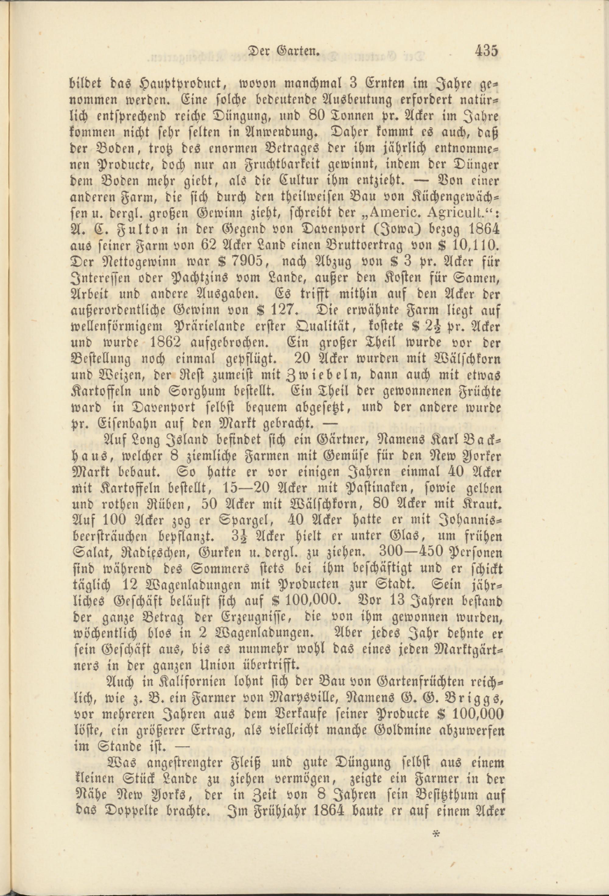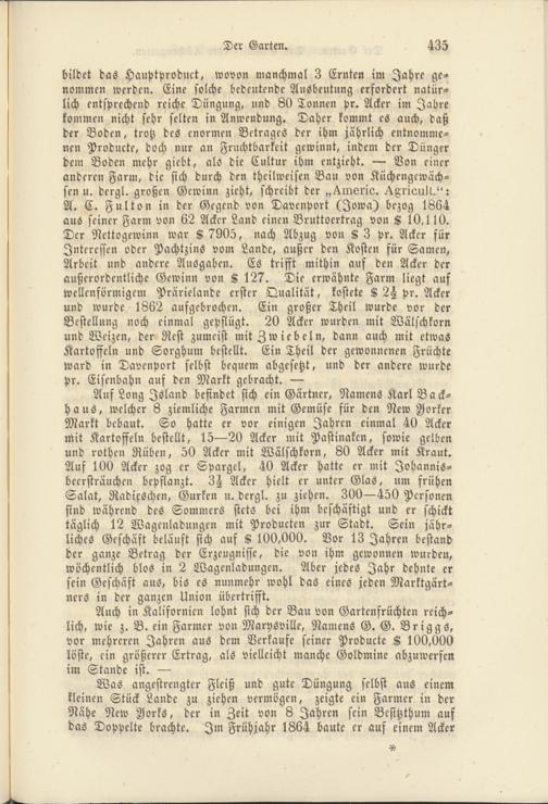 A. C. Fulton in der Gegend von Davenport (Iowa) bezog 1864 aus seiner Farm von 62 Acker Land einen Bruttoertrag von K 10,110. Der Nettogewinn war K 7905, nach Abzug von K 3 Pr. Acker für Interessen oder Pachtzins vom Lande, außer den Kosten für Samen, Arbeit und andere Ausgaben. Es trifft mithin auf den Acker der außerordentliche Gewinn von S 127. Die erwähnte Farm liegt auf wellenförmigem Prärielande erster Qualität, kostete S 2H pr. Acker und wurde 1862 aufgebrochen. Ein großer Theil wurde vor der Bestellung noch einmal gepflügt. 20 Acker wurden mit Wälschkorn und Weizen, der Rest zumeist mit Zwiebeln, dann auch mit etwas Kartoffeln und Sorghum bestellt. Ein Theil der gewonnenen Früchte ward in Davenport selbst bequem abgesetzt, und der andere wurde pr. Eisenbahn auf den Markt gebracht. —