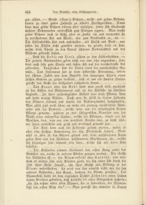 Der Kohl kann auch für Feldernte gebaut werden, wobei er aber eine fleißige Anwendung der sog. Pferdehackc bedarf. Mehr wird er aber in den Gärten gebaut und seine verschiedenen Arten geben stets eine den Städtern willkommene Marktwaare ab, welche für diejenigen sehr lohnend sein kann, welche sich mit deren Bau befassen.