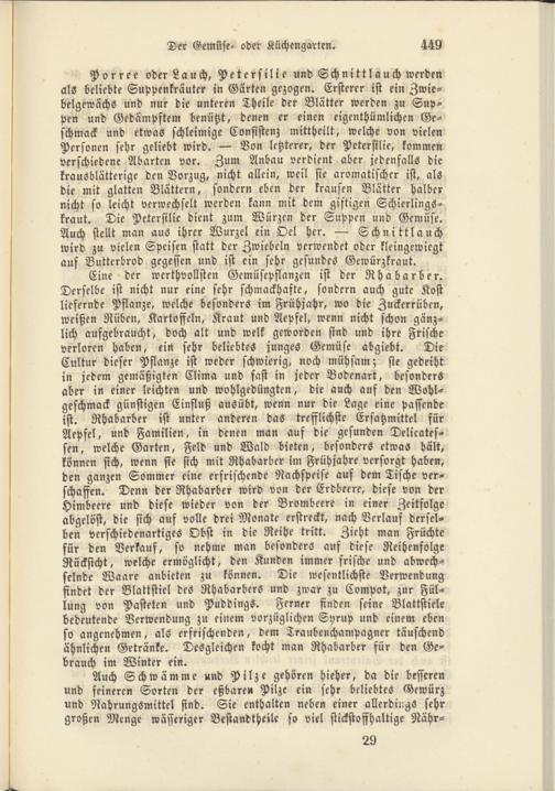 Eine der werthvollsten Gemüsepflanzen ist der Rhabarber. Derselbe ist nicht nur eine sehr schmackhafte, sondern auch gute Kost liefernde Pflanze, welche besonders im Frühjahr, wo die Zuckerrüben, weißen Rüben, Kartoffeln, Kraut und Aepfel, wenn nicht schon gänzlich aufgebraucht, doch alt und welk geworden sind und ihre Frische verloren haben, ein sehr beliebtes junges Gemüse abgiebt. Die Cultur dieser Pflanze ist weder schwierig, noch mühsam; sie gedeiht in jedem gemäßigten Clima und fast in jeder Bodenart, besonders aber in einer leichten und wohlgedüngten, die auch auf den Wohlgeschmack günstigen Einfluß ausübt, wenn nur die Lage eine passende ist. Rhabarber ist unter anderen das trefflichste Ersatzmittel für Aepfel, und Familien, in denen man auf die gesunden Delikatessen, welche Garten, Feld und Wald bieten, besonders etwas hält, können sich, wenn sie sich mit Rhabarber im Frühjahre versorgt haben, den ganzen Sommer eine erfrischende Nachspeise auf dem Tische verschaffen. Denn der Rhabarber wird von der Erdbeere, diese von der Himbeere und diese wieder von der Brombeere in einer Zeitfolge abgelöst, die sich auf volle drei Monate erstreckt, nach Verlauf derselben verschiedenartiges Obst in die Reihe tritt. Zieht man Früchte für den Verkauf, so nehme man besonders auf diese Reihenfolge Rücksicht, welche ermöglicht, den Kunden immer frische und abwechselnde Waare anbieten zu können. Die wesentlichste Verwendung findet der Blattstiel des Rhabarbers und zwar zu Compot, zur Füllung von Pasteten und Puddings. Ferner finden seine Blattstiele bedeutende Verwendung zu einem vorzüglichen Syrup und einem eben so angenehmen, als erfrischenden, dem Traubenchampagner täuschend ähnlichen Getränke. Desgleichen kocht man Rhabarber für den Gebrauch im Winter ein.