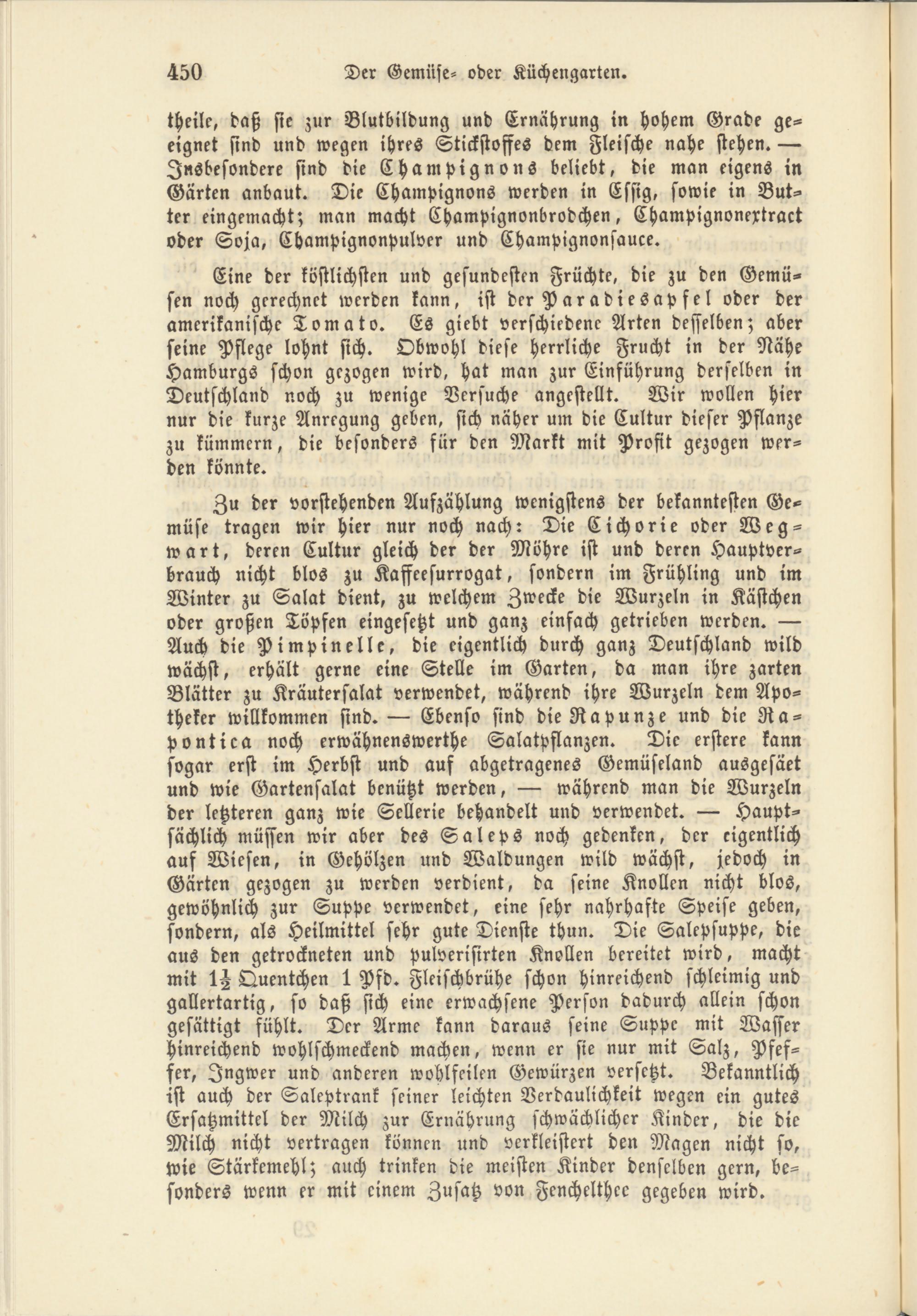 Zu der vorstehenden Aufzählung wenigstens der bekanntesten Gemüse tragen wir hier nur noch nach: Die Cichorie oder Wegwart, deren Cultur gleich der der Möhre ist und deren Hauptverbrauch nicht blos zu Kaffeesurrogat, sondern im Frühling und im Winter zu Salat dient, zu welchem Zwecke die Wurzeln in Kästchen oder großen Töpfen eingesetzt und ganz einfach getrieben werden. — Auch die Pimpinelle, die eigentlich durch ganz Deutschland wild wächst, erhält gerne eine Stelle im Garten, da man ihre zarten Blätter zu Kräutersalat verwendet, während ihre Wurzeln dem Apotheker willkommen sind. — Ebenso sind dieRa Punze und die Raps ntica noch erwähnenswerthe Salatpflanzen. Die erstere kann sogar erst im Herbst und auf abgetragenes Gemüseland ausgesäet und wie Gartensalat benützt werden, — während man die Wurzeln der letzteren ganz wie Sellerie behandelt und verwendet. — Hauptsächlich müssen wir aber des Saleps noch gedenken, der eigentlich auf Wiesen, in Gehölzen und Waldungen wild wächst, jedoch in Gärten gezogen zu werden verdient, da seine Knollen nicht blos, gewöhnlich zur Suppe verwendet, eine sehr nahrhafte Speise geben, sondern, als Heilmittel sehr gute Dienste thun. Die Salepsuppe, die aus den getrockneten und pulverisirten Knollen bereitet wird, macht mit Quentchen 1 Pfd. Fleischbrühe schon hinreichend schleimig und gallertartig, so daß sich eine erwachsene Person dadurch allein schon gesättigt fühlt. Der Arme kann daraus seine Suppe mit Wasser hinreichend wohlschmeckend machen, wenn er sie nur mit Salz, Pfeffer, Ingwer und anderen wohlfeilen Gewürzen versetzt. Bekanntlich ist auch der Saleptrank seiner leichten Verdaulichkeit wegen ein gutes Ersatzmittel der Milch zur Ernährung schwächlicher Kinder, die die Milch nicht vertragen können und verkleistert den Magen nicht so, wie Stärkemehl; auch trinken die meisten Kinder denselben gern, besonders wenn er mit einem Zusatz von Fenchelthec gegeben wird.