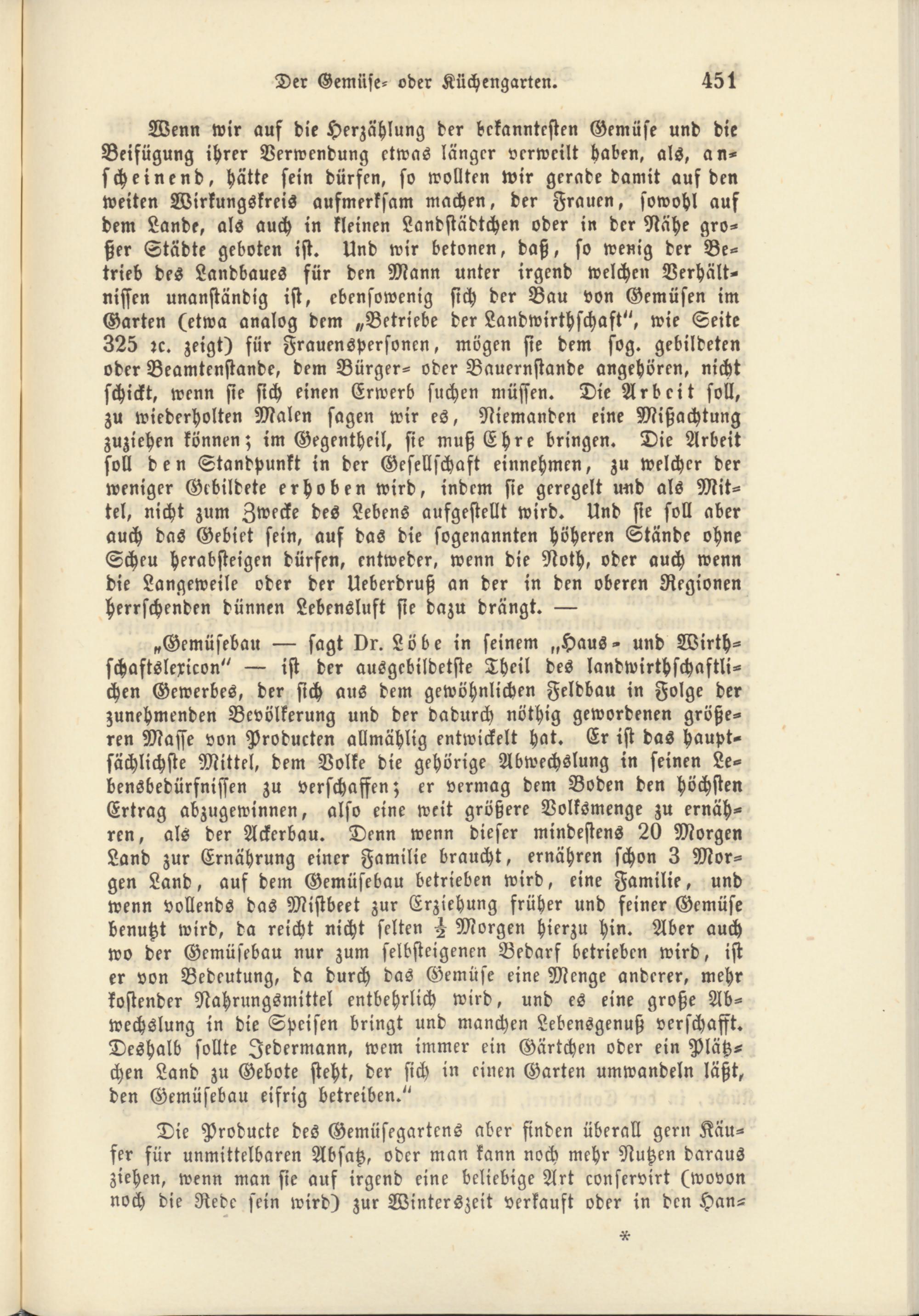 Wenn wir auf die Herzahlung der bekanntesten Gemüse und die Beifügung ihrer Verwendung etwas länger verweilt haben, als, anscheinend, hätte sein dürfen, so wollten wir gerade damit auf den weiten Wirkungskreis aufmerksam machen, der Frauen, sowohl auf dem Lande, als auch in kleinen Landstädtchen oder in der Nähe großer Städte geboten ist. Und wir betonen, daß, so wenig der Betrieb des Landbaues für den Mann unter irgend welchen Verhältnissen unanständig ist, ebensowenig sich der Bau von Gemüsen im Garten (etwa analog dem „Betriebe der Landwirthschaft", wie Seite 325 rc. zeigt) für Frauenspersonen, mögen sie dem sog. gebildeten oder Beamtenstande, dem Bürger- oder Bauernstande angehören, nicht schickt, wenn sie sich einen Erwerb suchen müssen. Die Arbeit soll, zu wiederholten Malen sagen wir es, Niemanden eine Mißachtung zuziehen können; im Gegentheil, sie muß Ehre bringen. Die Arbeit soll den Standpunkt in der Gesellschaft einnehmen, zu welcher der weniger Gebildete erhoben wird, indem sie geregelt und als Mittel, nicht zum Zwecke des Lebens aufgestellt wird. Und sie soll aber auch das Gebiet sein, auf das die sogenannten höheren Stände ohne Scheu herabsteigen dürfen, entweder, wenn die Noth, oder auch wenn die Langeweile oder der Ueberdruß an der in den oberen Regionen herrschenden dünnen Lebenslust sie dazu drängt. —