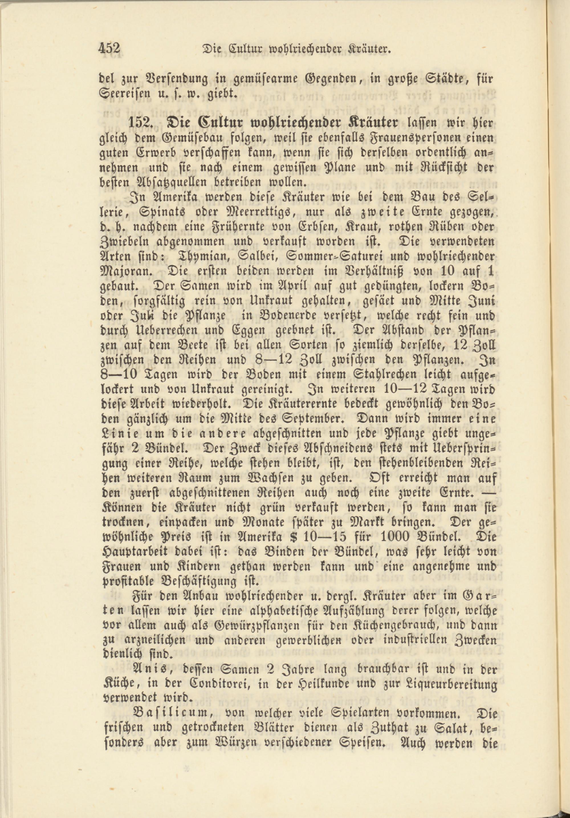 152. Die Cultur wohlriechender Kräuter lassen wir hier gleich dem Gemüsebau folgen, weil sie ebenfalls Frauenspersonen einen guten Erwerb verschaffen kann, wenn sie sich derselben ordentlich annehmen und sie nach einem gewissen Plane und mit Rücksicht der besten Absatzquellen betreiben wollen.