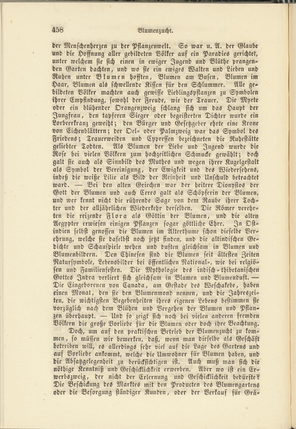 der Menschenherzen zu der Pflanzenwelt. So war u. A. der Glaube und die Hoffnung aller gebildeten Völker auf ein Paradies gerichtet, unter welchem sie sich einen in ewiger Jugend und Blüthe prangenden Garten dachten, und wo sie ein ewiges Walten und Lieben und Ruhen unter Blumen hofften, Blumen am Busen, Blumen im Haar, Blumen als schwellende Kissen für den Schlummer. Alle gebildeten Völker machten auch gewisse Lieblingspflanzen zu Symbolen ihrer Empfindung, sowohl der Freude, wie der Trauer. Die Myrte oder ein blühender Orangenzweig schlang sich um das Haupt der Jungfrau, den tapferen Sieger oder begeisterten Dichter wurde ein Lorbeerkranz geweiht; den Bürger und Gesetzgeber ehrte eine Krone von Eichenblättern; der Oel- oder Palmzweig war das Symbol des Friedens; Trauerweiden und Cypressen bezeichneten die Ruhestätte geliebter Todten. Als Blumen der Liebe und Jugend wurde die Rose bei vielen Völkern zum hochzeitlichen Schmucke gewählt; doch galt sie auch als Sinnbild des Muthes und wegen ihrer Kugelgestalt als Symbol der Vereinigung, der Ewigkeit und des Wiedersehens, indeß die weiße Lilie als Bild der Reinheit und Unschuld betrachtet ward. — Bei den alten Griechen war der heitere Dionysios der Gott der Blumen und auch Ceres galt als Schöpferin der Blumen, und wer kennt nicht die rührende Sage von dem Raube ihrer Tochter und der alljährlichen Wiederkehr derselben. Die Römer verehrten die reizende Flora als Göttin der Blumen, und die alten Aegypter erwiesen einigen Pflanzen sogar göttliche Ehre. In Ostindien selbst genossen die Blumen im Alterthume schon dieselbe Verehrung, welche sie daselbst noch jetzt finden, und die altindischen Gedichte und Schauspiele wehen und duften gleichsam in Blumen und Blumenbildern. Den Chinesen sind die Blumen seit ältesten Zeiten Natursymbole, Lebensbilder bei öffentlichen National-, wie bei relgiö- sen und Familienfesten. Die Mythologie des indisch - thibetanischen Gottes Jndra verliert sich gleichsam in Blumen und Bliimenduft. — Die Eingeborenen von Canada, am Gestade des Weschakebe, haben einen Monat, den sie den Blumenmond nennen, und die Jahreszeiten, die wichtigsten Begebenheiten ihres eigenen Lebens bestimmen sie vorzüglich nach dem Blühen und Vergehen der Blumen und Pflanzen überhaupt. — Und so zeigt sich noch bei vielen anderen fremden Völkern die große Vorliebe für die Blumen oder doch ihre Beachtung.