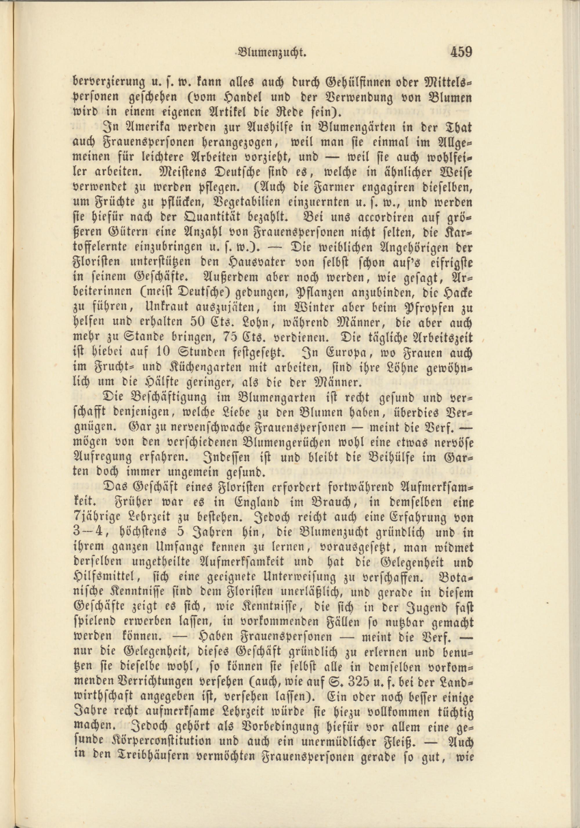 Das Geschäft eines Floristen erfordert fortwährend Aufmerksamkeit. Früher war es in England im Brauch, in demselben eine 7jährige Lehrzeit zu bestehen. Jedoch reicht auch eine Erfahrung von 3 — 4, höchstens 5 Jahren hin, die Blumenzucht gründlich und in ihrem ganzen Umfange kennen zu lernen, vorausgesetzt, man widmet derselben ungetheilte Aufmerksamkeit und hat die Gelegenheit und Hilfsmittel, sich eine geeignete Unterweisung zu verschaffen. Botanische Kenntnisse sind dem Floristen unerläßlich, und gerade in diesem Geschäfte zeigt es sich, wie Kenntnisse, die sich in der Jugend fast spielend erwerben lassen, in vorkommenden Fällen so nutzbar gemacht werden können. — Haben Frauenspersonen — meint die Verf. — nur die Gelegenheit, dieses Geschäft gründlich zu erlernen und benutzen sie dieselbe wohl, so können sie selbst alle in demselben vorkommenden Verrichtungen versehen (auch, wie auf S. 325 u. f. bei der Landwirthschaft angegeben ist, versehen lassen). Ein oder noch besser einige Jahre recht aufmerksame Lehrzeit würde sie hiezu vollkommen tüchtig machen. Jedoch gehört als Vorbedingung hiefür vor allem eine gesunde Körperconstitution und auch ein unermüdlicher Fleiß. — Auch in den Treibhäusern vermöchten Frauenspersonen gerade so gut, wie