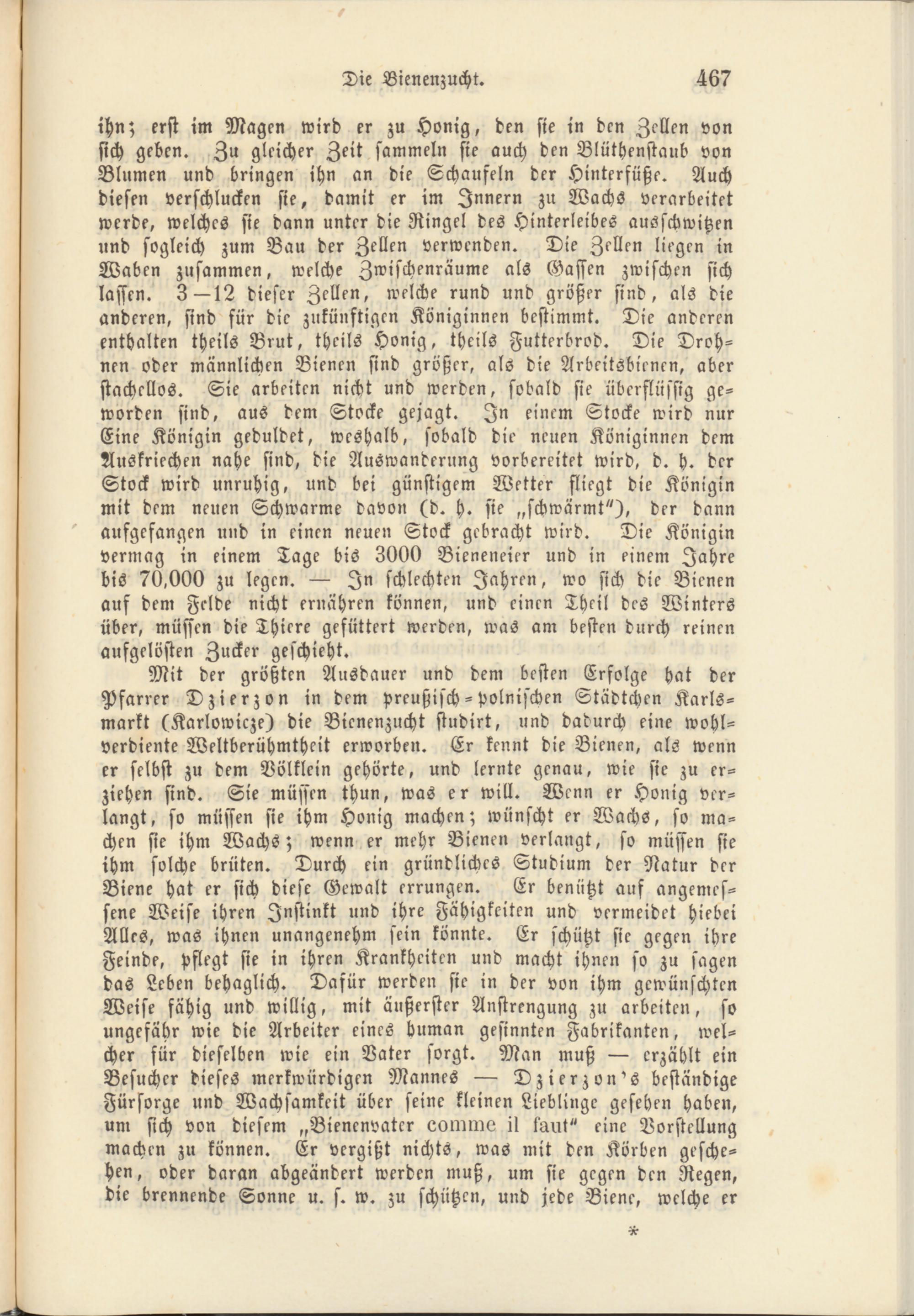 Mit der größten Ausdauer und dem besten Erfolge hat der Pfarrer Dzierzon in dem preußisch-polnischen Städtchen Karlsmarkt (Karlowicze) die Bienenzucht studirt, und dadurch eine wohlverdiente Weltberühmtheit erworben. Er kennt die Bienen, als wenn er selbst zu dem Völklein gehörte, und lernte genau, wie sie zu erziehen sind. Sie müssen thun, was er will. Wenn er Honig verlangt, so müssen sie ihm Honig machen; wünscht er Wachs, so machen sie ihm Wachs; wenn er mehr Bienen verlangt, so müssen sie ihm solche brüten. Durch ein gründliches Studium der Natur der Biene hat er sich diese Gewalt errungen. Er benützt auf angemessene Weise ihren Instinkt und ihre Fähigkeiten und vermeidet Hiebei Alles, was ihnen unangenehm sein könnte. Er schützt sie gegen ihre Feinde, pflegt sie in ihren Krankheiten und macht ihnen so zu sagen das Leben behaglich. Dafür werden sie in der von ihm gewünschten Weise fähig und willig, mit äußerster Anstrengung zu arbeiten, so ungefähr wie die Arbeiter eines human gesinnten Fabrikanten, welcher für dieselben wie ein Vater sorgt. Man muß — erzählt ein Besucher dieses merkwürdigen Mannes — Dzierzon's beständige Fürsorge und Wachsamkeit über seine kleinen Lieblinge gesehen haben, um sich von diesem „Bienenvatcr eomme il laut" eine Vorstellung machen zu können. Er vergißt nichts, was mit den Körben geschehen, oder daran abgeändert werden muß, um sie gegen den Regen, die brennende Sonne u. s. w. zu schützen, und jede Biene, welche er