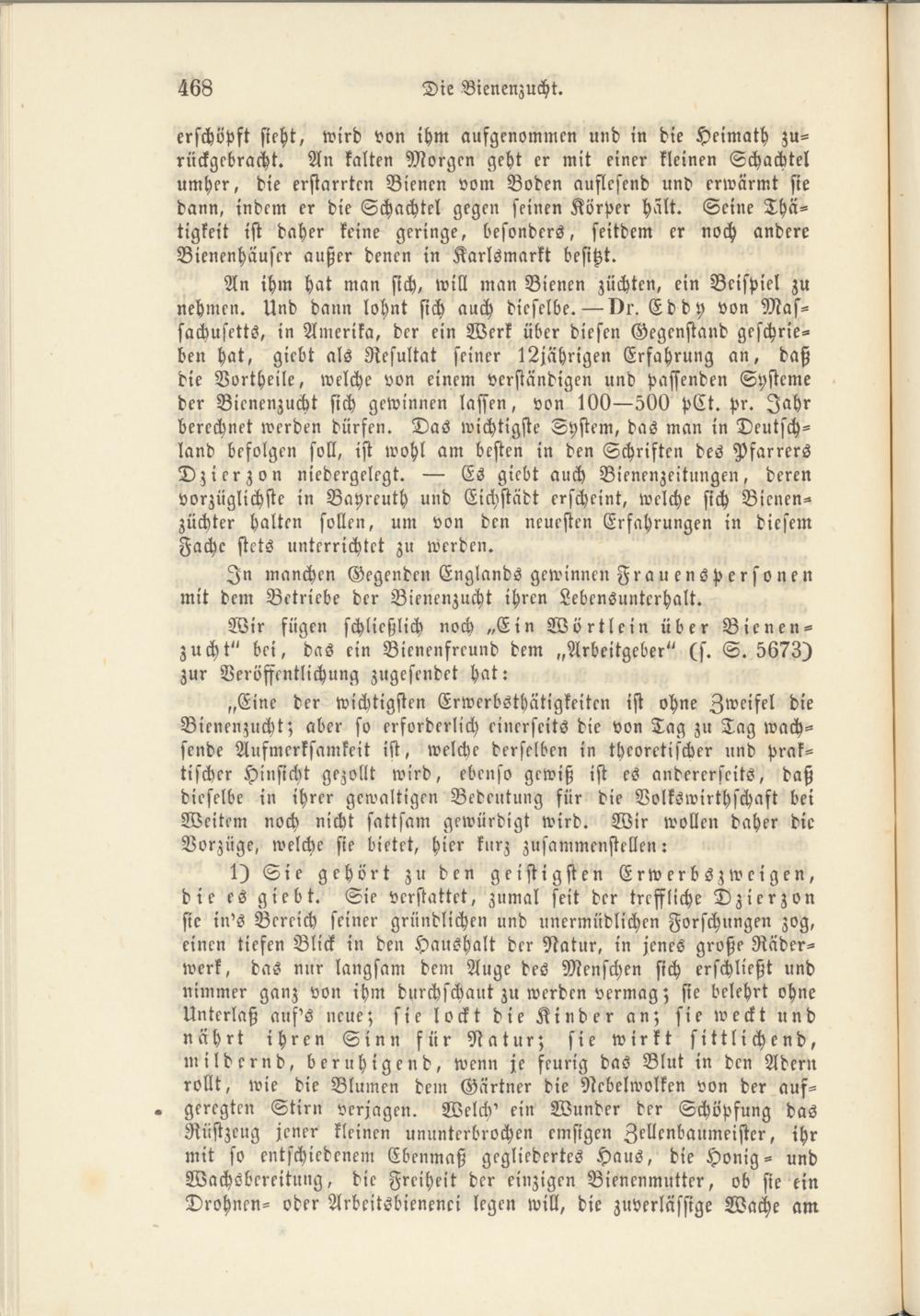 An ihm hat man sich, will man Bienen züchten, ein Beispiel zu nehmen. Und dann lohnt sich auch dieselbe. — Dr. Eddy von Massachusetts, in Amerika, der ein Werk über diesen Gegenstand geschrieben hat, giebt als Resultat seiner 12jährigen Erfahrung an, daß die Vortheile, welche von einem verständigen und passenden Systeme der Bienenzucht sich gewinnen lassen, von 100—500 pCt. pr. Jahr berechnet werden dürfen. Das wichtigste System, das man in Deutschland befolgen soll, ist wohl am besten in den Schriften des Pfarrers Dzicrzon niedergelegt. — Es giebt auch Bienenzeitungen, deren vorzüglichste in Bayreuth und Eichstädt erscheint, welche sich Bienenzüchter halten sollen, um von den neuesten Erfahrungen in diesem Fache stets unterrichtet zu werden.