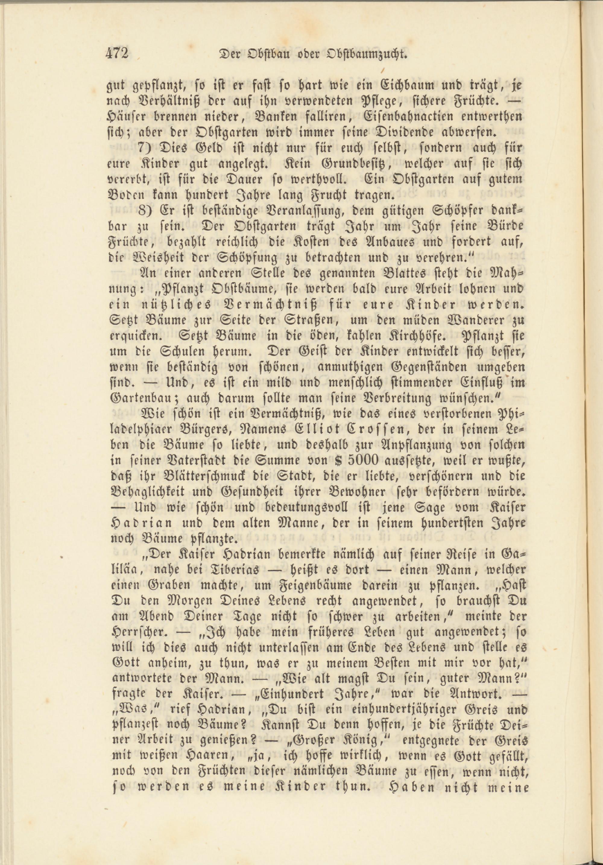 Wie schön ist ein Vermächtniß, wie das eines verstorbenen Phi- ladelphiaer Bürgers, Namens Elliot Er offen, der in seinem Leben die Bäume so liebte, und deshalb zur Anpflanzung von solchen in seiner Vaterstadt die Summe von K 5000 aussetzte, weil er wußte, daß ihr Blätterschmuck die Stadt, die er liebte, verschönern und die Behaglichkeit und Gesundheit ihrer Bewohner sehr befördern würde. — Und wie schön und bedeutungsvoll ist jene Sage vom Kaiser Hadrian und dem alten Manne, der in seinem hundertsten Jahre noch Bäume pflanzte.