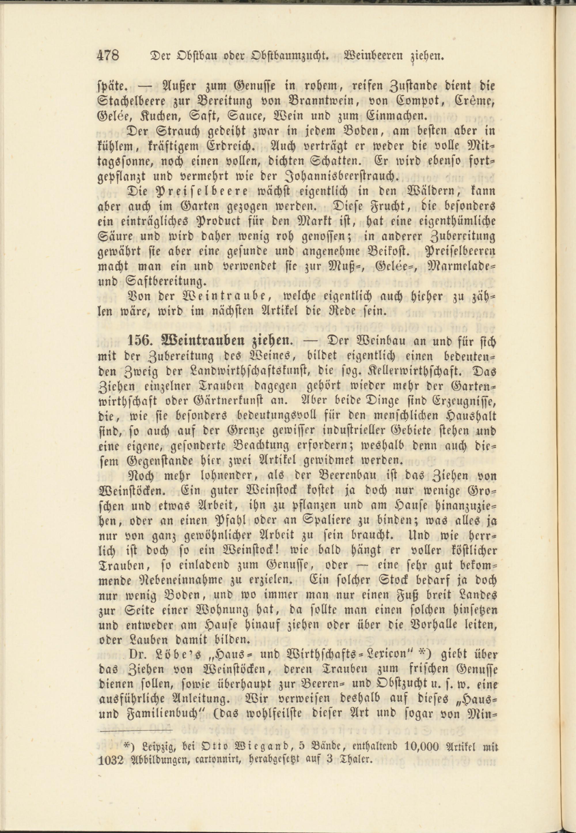 Dr. Löbe's „Haus- und Wirthschafts - Lexikon" giebt über das Ziehen von Weinstöcken, deren Trauben zum frischen Genusse dienen sollen, sowie überhaupt zur Beeren- und Obstzucht u. s. w. eine ausführliche Anleitung. Wir verweisen deshalb auf dieses „Hausund Familienbuch" (das wohlfeilste dieser Art und sogar von Min-