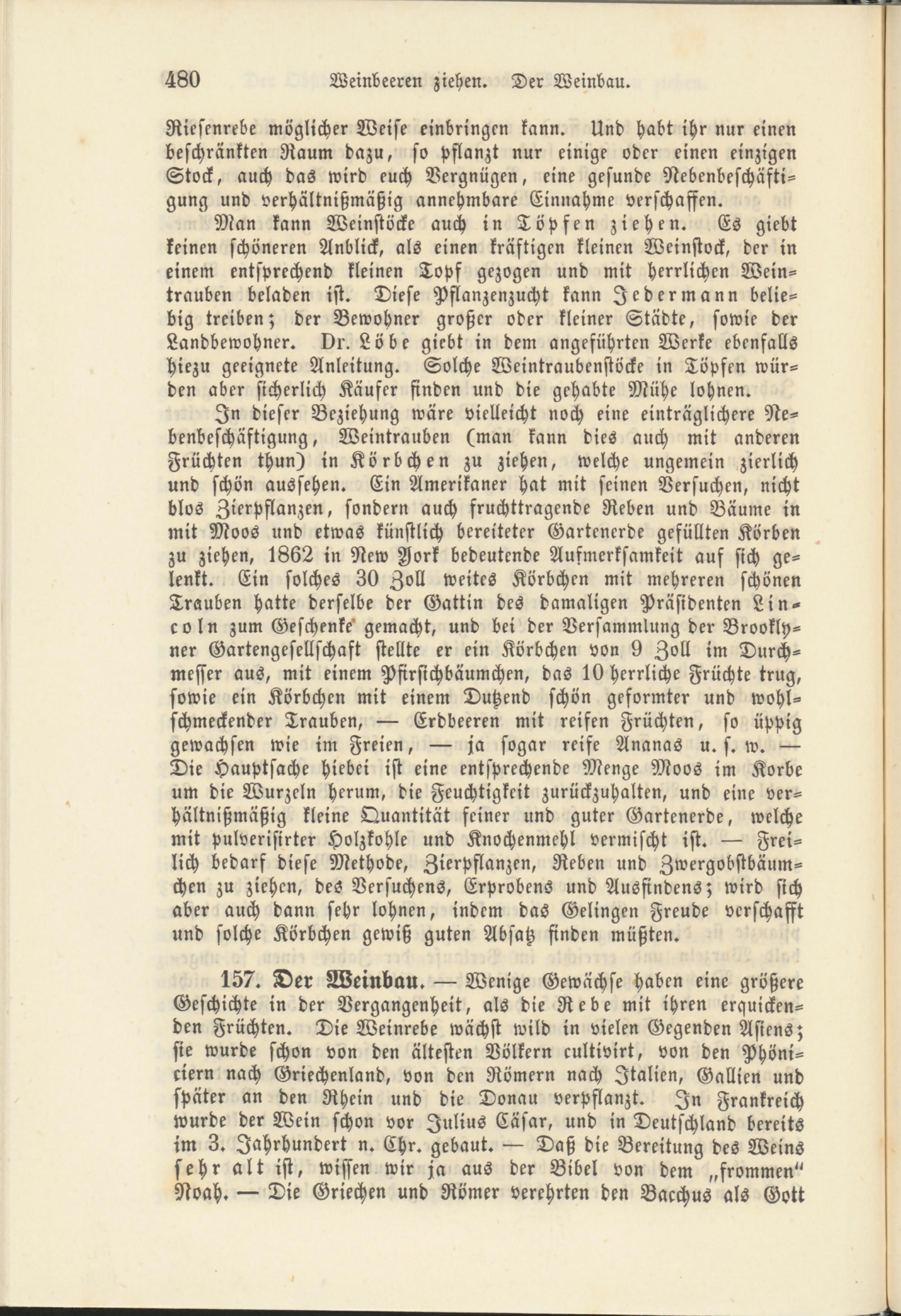 157. Der Weinbau. — Wenige Gewächse haben eine größere Geschichte in der Vergangenheit, als die Rebe mit ihren erquickenden Früchten. Die Weinrebe wächst wild in vielen Gegenden Asiens; sie wurde schon von den ältesten Völkern cultivirt, von den Phöniciern nach Griechenland, von den Römern nach Italien, Gallien und später an den Rhein und die Donau verpflanzt. In Frankreich wurde der Wein schon vor Julius Cäsar, und in Deutschland bereits im 3. Jahrhundert n. Chr. gebaut. — Daß die Bereitung des Weins sehr alt ist, wissen wir ja aus der Bibel von dem „frommen" Noah. — Die Griechen und Römer verehrten den Bacchus als Gott
