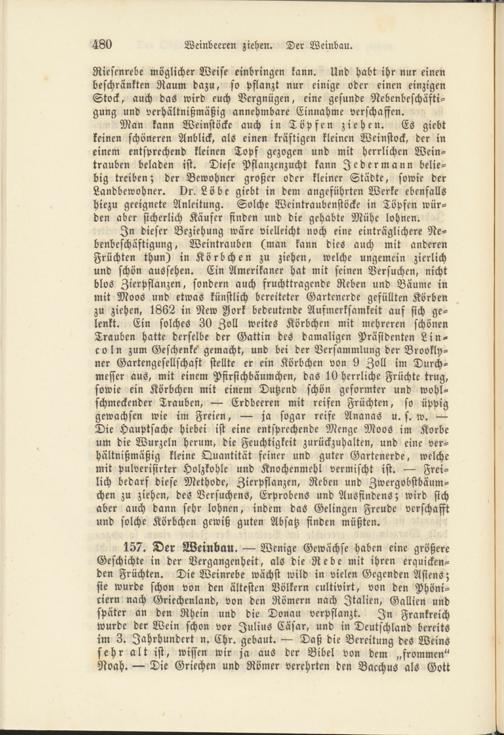 Man kann Weinstöcke auch in Töpfen ziehen. Es giebt keinen schöneren Anblick, als einen kräftigen kleinen Weinstock, der in einem entsprechend kleinen Topf gezogen und mit herrlichen Weintrauben beladen ist. Diese Pflanzenzucht kann Jedermann beliebig treiben; der Bewohner großer oder kleiner Städte, sowie der Landbewohner. Dr. Löbe giebt in dem angeführten Werke ebenfalls hiezu geeignete Anleitung. Solche Weintraubenstöcke in Töpfen würden aber sicherlich Käufer finden und die gehabte Mühe lohnen.