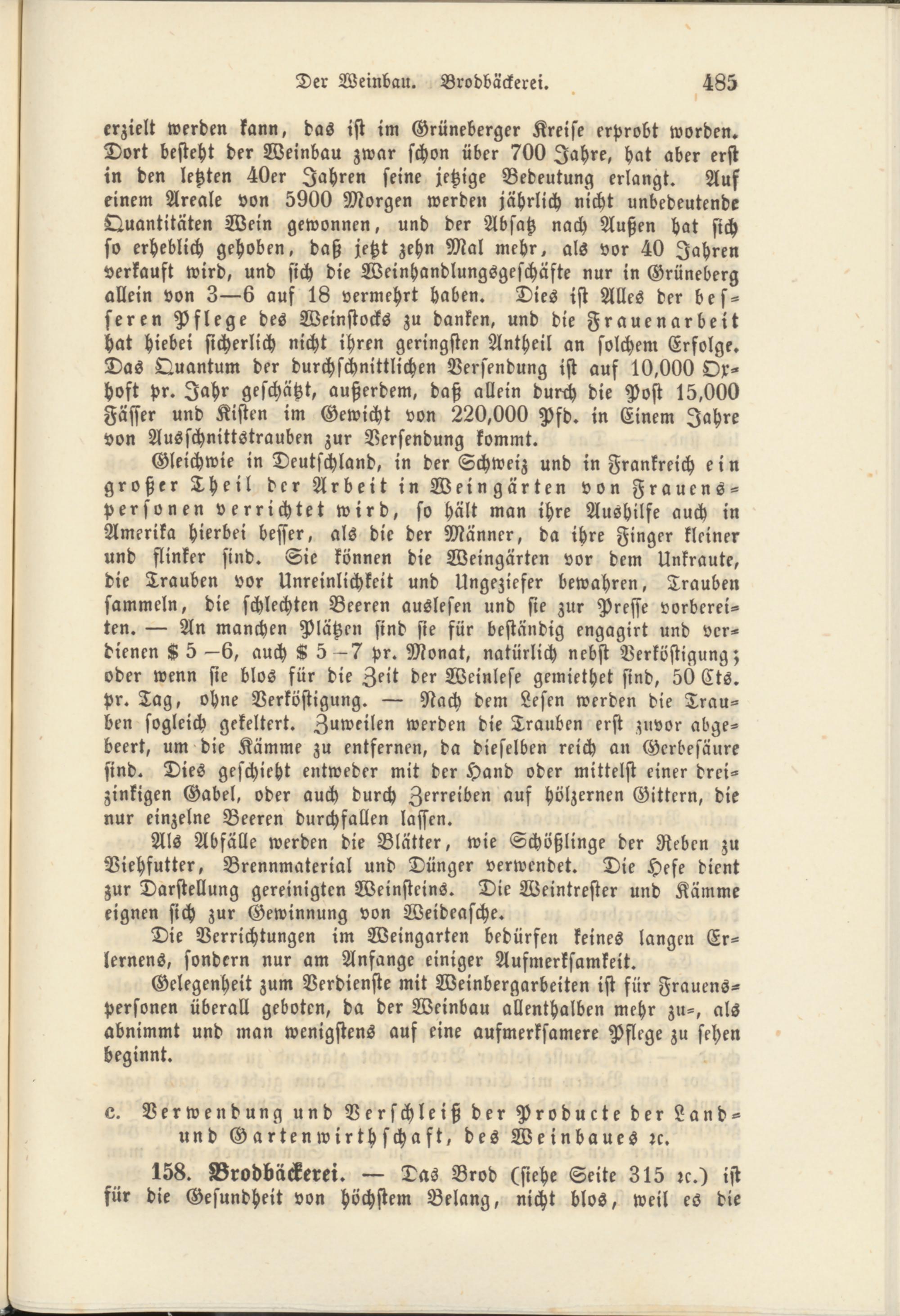 erzielt werden kann, das ist im Grüneberger Kreise erprobt worden. Dort besteht der Weinbau zwar schon über 700 Zahre, hat aber erst in den letzten 40er Jahren seine jetzige Bedeutung erlangt. Auf einem Areale von 5900 Morgen werden jährlich nicht unbedeutende Quantitäten Wein gewonnen, und der Absatz nach Außen hat sich so erheblich gehoben, daß jetzt zehn Mal mehr, als vor 40 Jahren verkauft wird, und sich die Weinhandlungsgeschäste nur in Grüneberg allein von 3—6 auf 18 vermehrt haben. Dies ist Alles der besseren Pflege des Weinstocks zu danken, und die Frauenarbeit hat Hiebei sicherlich nicht ihren geringsten Antheil an solchem Erfolge. Das Quantum der durchschnittlichen Versendung ist auf 10,000 Ox- Host pr. Jahr geschätzt, außerdem, daß allein durch die Post 15,000 Fässer und Kisten im Gewicht von 220,000 Pfd. in Einem Jahre von Ausschnittstrauben zur Versendung kommt.