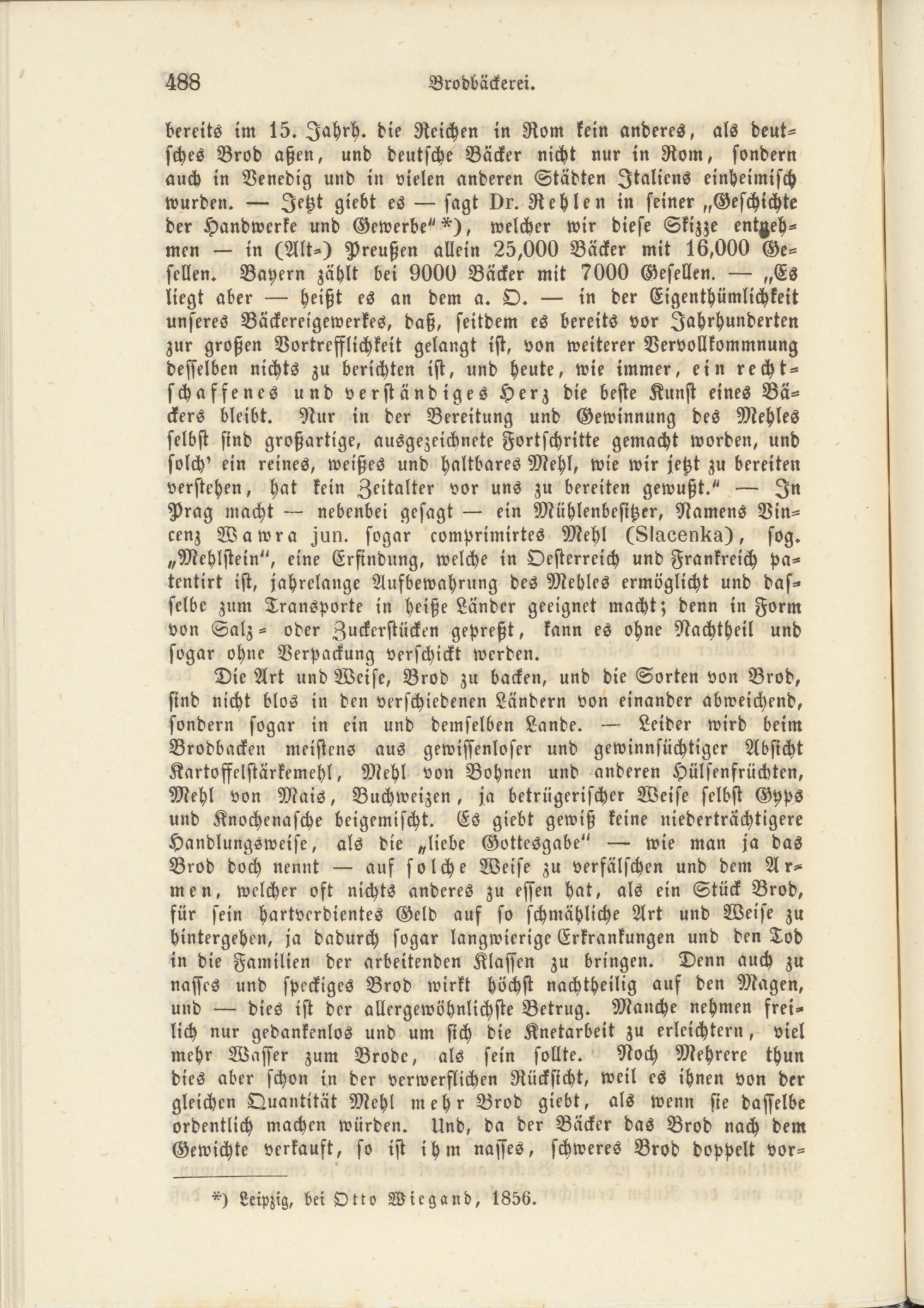 Die Art und Weise, Brod zu backen, und die Sorten von Brod, sind nicht blos in den verschiedenen Ländern von einander abweichend, sondern sogar in ein und demselben Lande. — Leider wird beim Brodbacken meistens aus gewissenloser und gewinnsüchtiger Absicht Kartoffclstärkemehl, Mehl von Bohnen und anderen Hülsenfrüchten, Mehl von Mais, Buchweizen, ja betrügerischer Weise selbst Gyps und Knochenasche beigemischt. Es giebt gewiß keine niederträchtigere Handlungsweise, als die „liebe Gottesgabe" — wie man ja das Brod doch nennt — auf solche Weise zu verfälschen und dem Armen. welcher oft nichts anderes zu essen hat, als ein Stück Brod, für sein hartverdientes Geld auf so schmähliche Art und Weise zu hintergehen, ja dadurch sogar langwierige Erkrankungen und den Tod in die Familien der arbeitenden Klassen zu bringen. Denn auch zu nasses und speckiges Brod wirkt höchst nachteilig auf den Magen, und — dies ist der allergewöhnlichste Betrug. Manche nehmen freilich nur gedankenlos und um sich die Knetarbeit zu erleichtern, viel mehr Wasser zum Brode, als sein sollte. Noch Mehrere thun dies aber schon in der verwerflichen Rücksicht, weil es ihnen von der gleichen Quantität Mehl mehr Brod giebt, als wenn sie dasselbe ordentlich machen würden. Und, da der Bäcker das Brod nach dem Gewichte verkauft, so ist ihm nasses, schweres Brod doppelt vor-