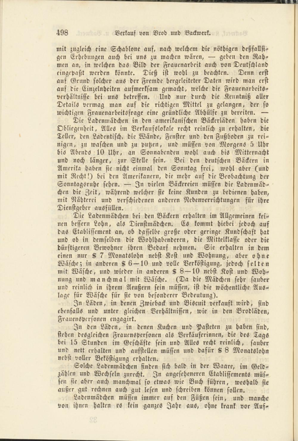 Die Ladenmädchen in den amerikanischen Bäckerläden haben die Obliegenheit, Alles im Verkaufslokale recht reinlich zu erhalten, die Teller, den Ladentisch, die Wände, Fenster und den Fußboden zu reinigen, zu waschen und zu putzen, und müssen von Morgens 5 Uhr bis Abends 10 Uhr, an Sonnabenden wohl auch bis Mitternacht und noch länger, zur Stelle sein. Bei den deutschen Bäckern in Amerika haben sie nicht einmal den Sonntag frei, wohl aber (und mit Recht!) bei den Amerikanern, die mehr auf die Beobachtung der Sonntagsruhe sehen. — In vielen Bäckereien müssen die Ladenmädchen die Zeit, während welcher sie keine Kunden zu bedienen haben, mit Nähtcrci und verschiedenen anderen Nebenverrichtungen für ihre Dienstgeber ausfüllen.
