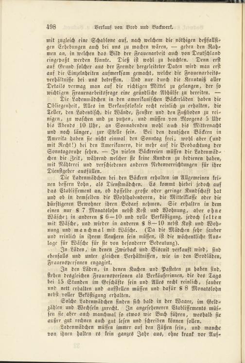 In den Läden, in denen Kuchen und Pasteten zu haben sind, stehen desgleichen Frauenspersonen als Verkäuferinnen, die des Tags bei 15 Stunden im Geschäfte sein und Alles recht reinlich, sauber und nett erhalten und aufstellen müssen und dafür 8 8 Monatslohn nebst voller Beköstigung erhalten.