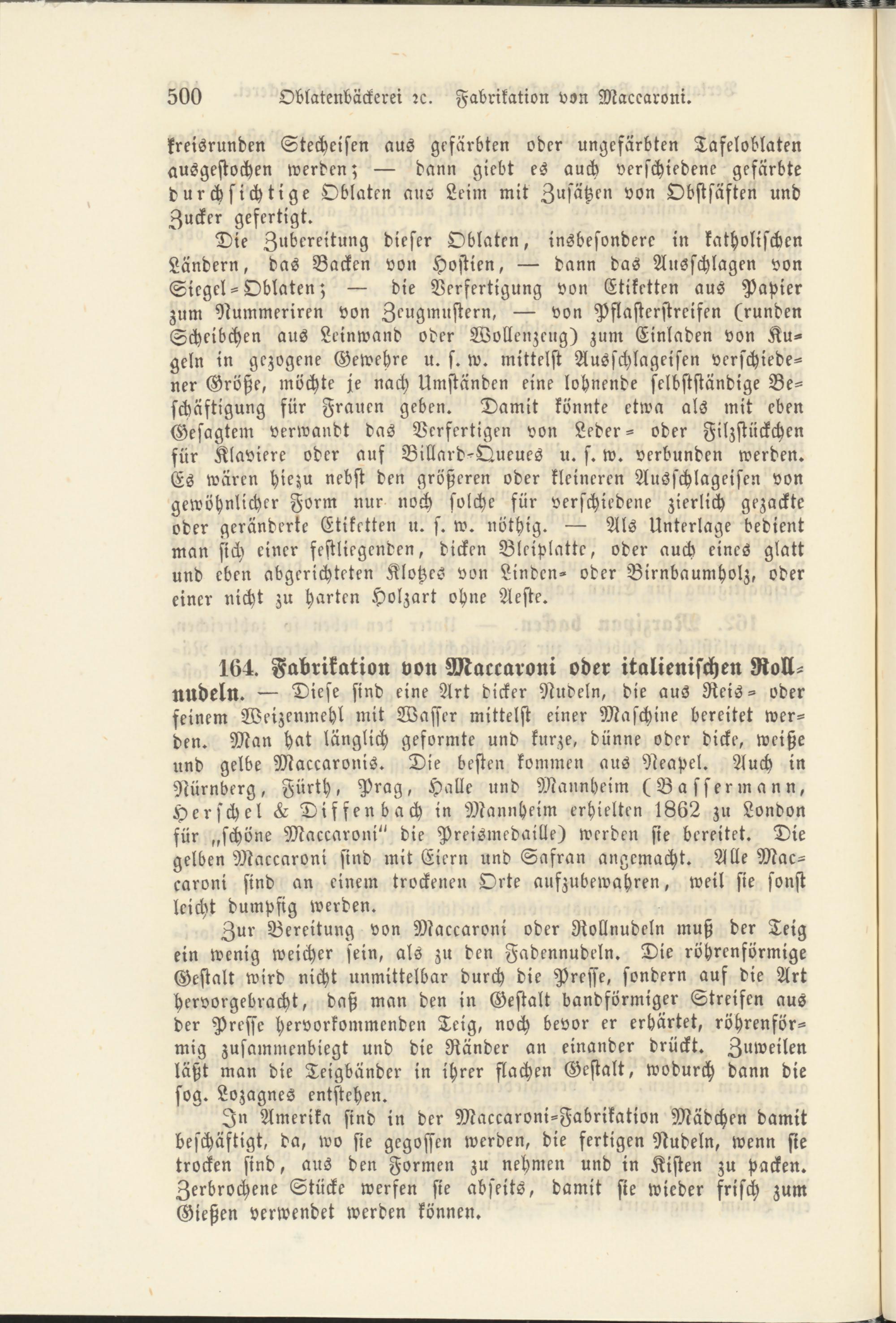 164. Fabrikation von Maccaroni oder italienischen Roll- nudeln. — Diese sind eine Art dicker Nudeln, die aus Reis- oder feinem Weizenmehl mit Wasser mittelst einer Maschine bereitet werden. Man hat länglich geformte und kurze, dünne oder dicke, weiße und gelbe Maccaronis. Die besten kommen aus Neapel. Auch in Nürnberg, Fürth, Prag, Halle und Mannheim (Bassermann, Herschel L Diffenbach in Mannheim erhielten 1862 zu London für „schöne Maccaroni" die Preismedaille) werden sie bereitet. Die gelben Maccaroni sind mit Eiern und Safran angemacht. Alle Maccaroni sind an einem trockenen Orte aufzubewahren, weil sie sonst leicht dumpfig werden.