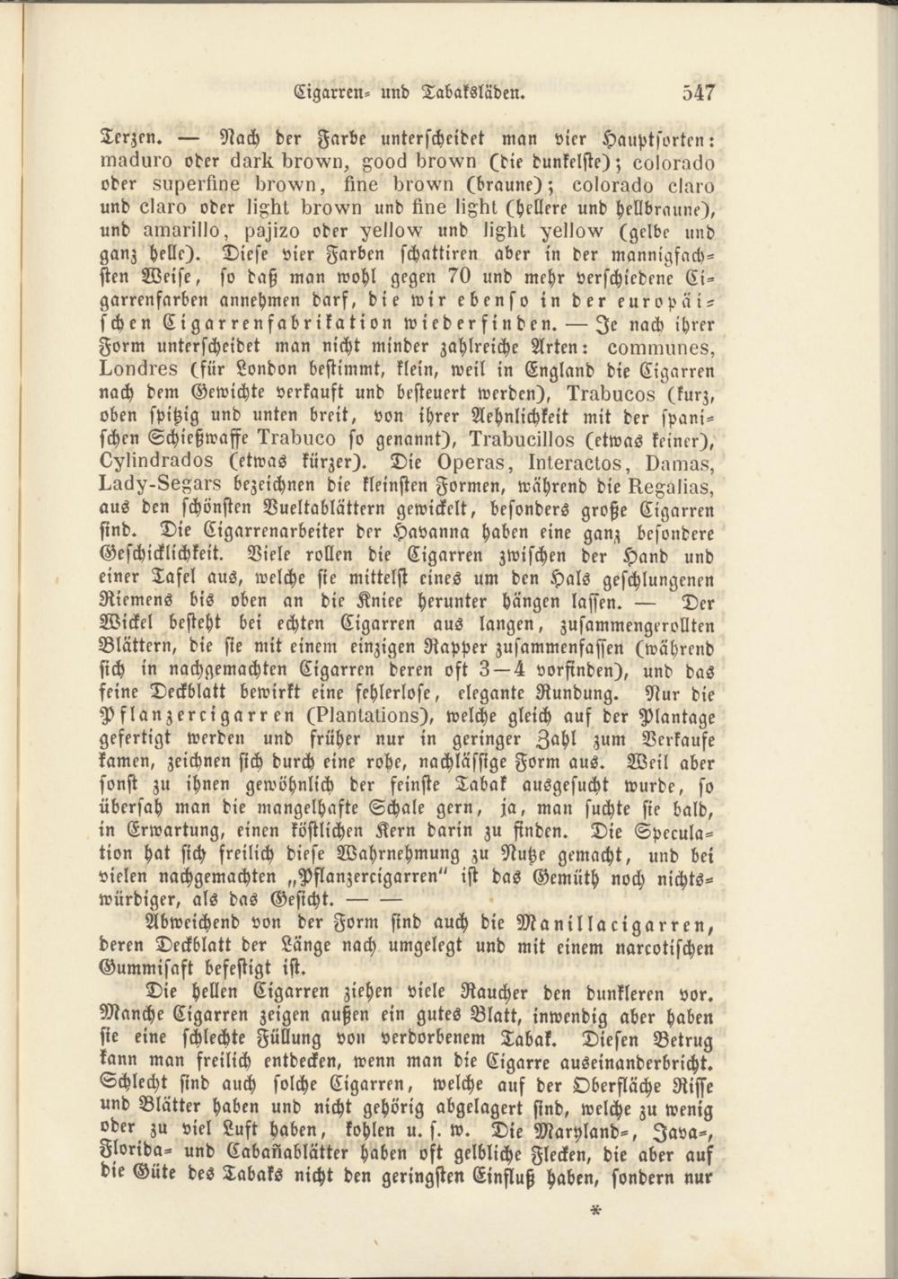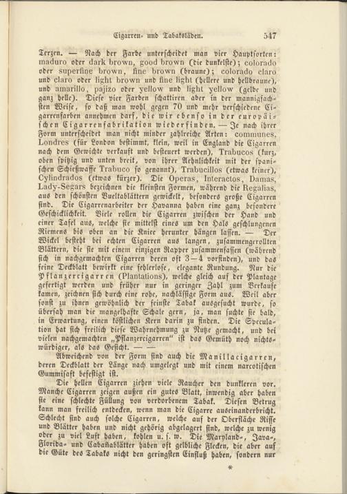 Die hellen Cigarren ziehen viele Raucher den dunkleren vor. Manche Cigarren zeigen außen ein gutes Blatt, inwendig aber haben sie eine schlechte Füllung von verdorbenem Tabak. Diesen Betrug kann man freilich entdecken, wenn man die Cigarre auseinanderbricht. Schlecht sind auch solche Cigarren, welche auf der Oberfläche Risse und Blätter haben und nicht gehörig abgelagert sind, welche zu wenig oder zu viel Luft haben, kohlen u. s. w. Die Maryland-, Java-, Florida- und Cabariablätter haben oft gelbliche Flecken, die aber auf die Güte des Tabaks nicht den geringsten Einfluß haben, sondern nur