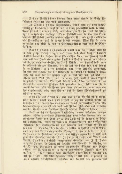 Auf der letzten Londoner Ausstellung waren besonders ausgezeichnet schöne getrocknete Küchenkräuter vom besten Aroma und gut erhaltener Farbe von Butler L McCulloch in London, in Büchsen aufbewahrt. Auch Essenzen aus Kiichenkräutern und verschiedene Zwiebeln für Küchengebrauch von schönem und reinem Geschmacke sah man. - Von deutschen Geschäften hatten ausgestellt: John Grüneberg aus Berlin eingemachte Spargel, Erbsen u. s. w. — I. C. Lehmann in Potsdam in Zucker und Essig eingemachte Früchte und gemischte Gemüse. — G. K. Hahn «k Comp. aus Lübeck und