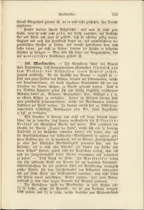 186. Marktweiber. — Die Verfasserin führt den Beweis ihrer Behauptung, daß Frauenspersonen allenthalben öffentlich aus dem Verkaufe von Viktualien einen Erwerb ziehen, ziemlich weitläufig. An der Seeküste von Bornes — erzählt sie — sieht man ganze Flotten von Kähnen, beladen mit Lebensmitteln, welche von Frauenspersonen, die durch ungeheure Bambushüte sich vor den Strahlen der Sonne schützen, zu Markte gebracht werden. Auch in den Städten Egyptens geben sich sehr häufig sorgfältig verschleierte Mädchen damit ab, Melonen, Granatäpfel, Eier, Geflügel u. s. w. an offenen Plätzen zu verkaufen. Ferner im südlichen Europa sieht man gewöhnlich Frauenspersonen, welche mit Marktwaaren beladene Lastthiere zur Stadt treiben. In London endlich sind ca. 2000 Frauenspersonen beschäftigt, Grünwaaren jeder Art, sowie Vogelfutter u. dgl. zu verkaufen.