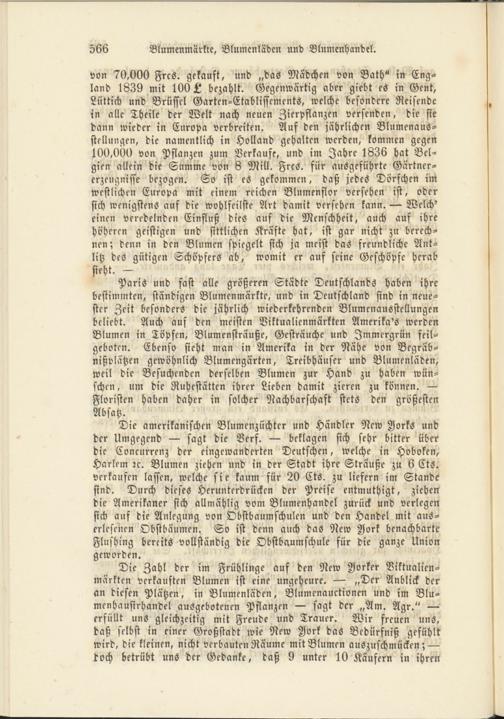 Paris und fast alle größeren Städte Deutschlands haben ihre bestimmten, ständigen Blumenmärkte, und in Deutschland sind in neuester Zeit besonders die jährlich wiederkehrenden Blumenausstellungen beliebt. Auch aus den meisten Viktualienmärkten Amerika's werden Blumen in Töpfen, Blumensträuße, Gesträuche und Immergrün feilgeboten. Ebenso sieht man in Amerika in der Nähe von Begräb- nißplätzen gewöhnlich Blumengärten, Treibhäuser und Blumenläden, weil die Besuchenden derselben Blumen zur Hand zu haben wünschen, um die Ruhestätten ihrer Lieben damit zieren zu können. — Floristen haben daher in solcher Nachbarschaft stets den größesten Absatz.