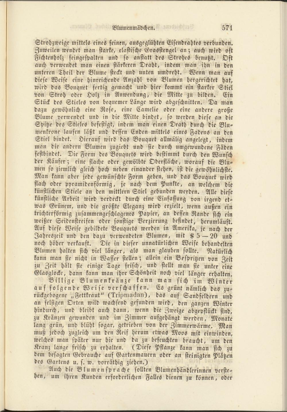 Strohzweige mittels eines feinen, ausgeglühten Eisendrahtes verbunden. Zuweilen wendet man starke, elastische Grasstengel an; auch wird oft Fichtenholz feingespalten und so anstatt des Strohes benutzt. Oft auch verwendet man einen stärkeren Draht, indem man ihn in den unteren Theil der Blume steckt und unten umdreht. Wenn man auf diese Weise eine hinreichende Anzahl von Blumen hergerichtet hat, wird das Bonquet fertig gemacht und hier kommt ein starker Stiel von Stroh oder Holz in Anwendung, die Mitte zu bilden. Ein Stück des Stieles von bequemer Länge wird abgeschnitten. Da man dazu gewöhnlich eine Rose, eine Camelie oder eine andere große Blume verwendet und in die Mitte bindet, so werden diese an die Spitze des Stieles befestigt, indem man einen Drath durch die Blumenkrone laufen läßt und dessen Enden mittels eines Fadens an den Stiel bindet. Hierauf wird das Bouquet allmälig angelegt, indem man die andern Blumen zugiebt und sie durch umgewundene Fäden festbindet. Die Form des Bouquets wird bestimmt durch den Wunsch der Käufer; eine stäche oder gewölbte Oberstäche, worauf die Blumen so ziemlich gleich hoch neben einander stehen, ist die gewöhnlichste. Man kann aber jede gewünschte Form geben, und das Bouquet wird stach oder pyramidenförmig, je nach dem Punkte, an welchem die künstlichen Stiele an den mittlern Stiel gebunden werden. Alle diese künstliche Arbeit wird verdeckt durch eine Einfassung von irgend etwas Grünem, und die größte Eleganz wird erzielt, wenn außen ein trichterförmig zusammengeschlagenes Papier, an dessen Rande sich ein weißer Seidenstreifen oder sonstige Verzierung befindet, herumläuft. Auf diese Weise gebildete Bouquets werden in Amerika, je nach der Jahreszeit und den dazu verwendeten Blumen, mit K5—20 und noch höher verkauft. Die in dieser unnatürlichen Weise behandelten Blumen halten sich viel länger, als man glauben sollte. Natürlich kann man sie nicht in Wasser stellen; allein ein Bespritzen von Zeit zu Zeit hält sie einige Tage frisch, und stellt man sie unter eine Glasglocke, dann kann man ihre Schönheit noch viel langer erhalten.