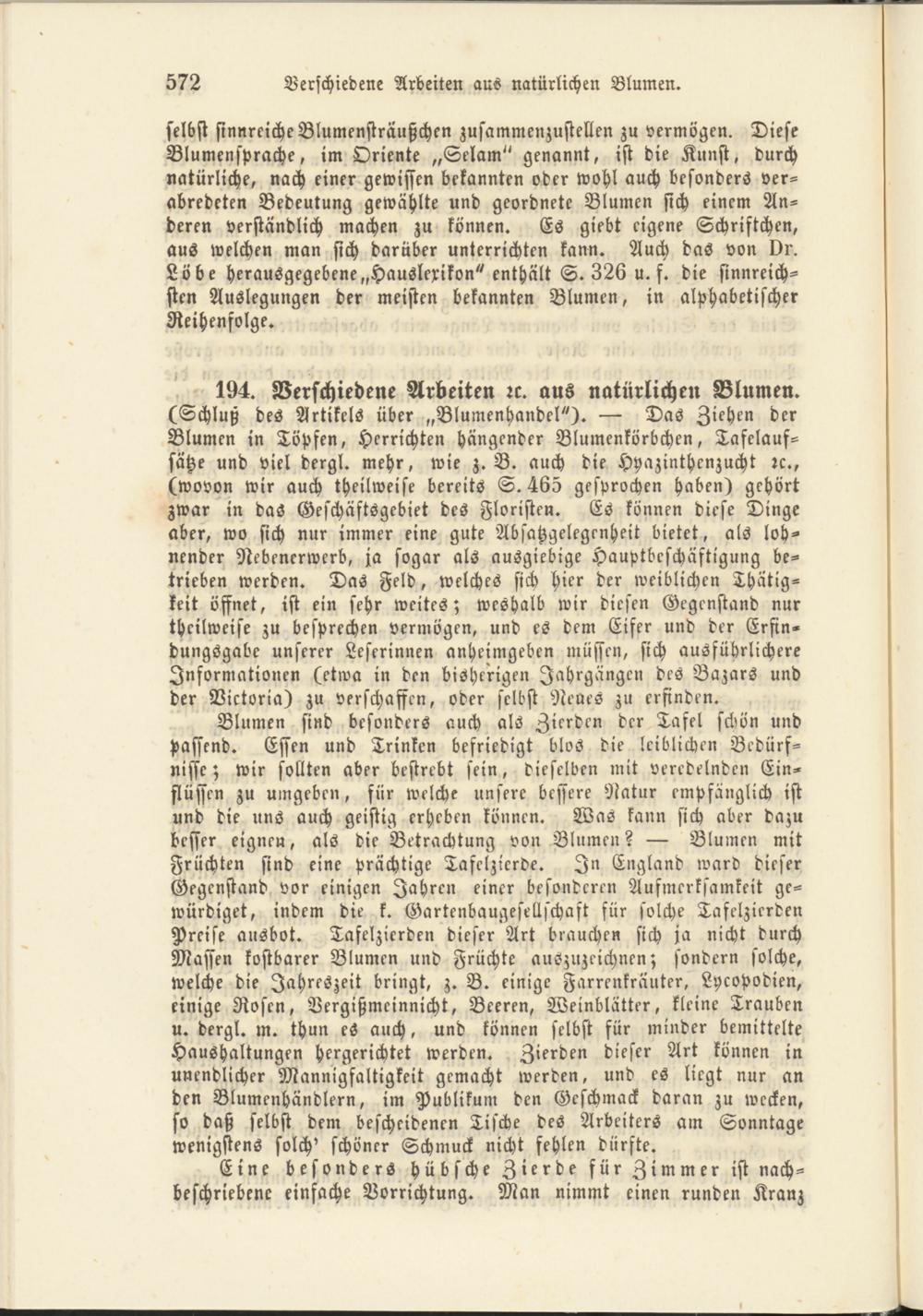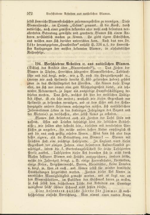 (Schluß des Artikels überBlumenhandel"). Das Ziehen der Blumen in Töpfen, Herrichten hängender Blumenkörbchen, Tafelauf­sätze und viel dergl. mehr, wie z. B. auch die Hyazinthcnzucht rc., (wovon wir auch theilweise bereits S. 465 gesprochen haben) gehört zwar in das Geschäftsgebiet des Floristen. Es können diese Dinge aber, wo sich nur immer eine gute Absatzgelegrnheit bietet, als loh­nender Nebenerwerb, ja sogar als ausgiebige Hauptbeschäftigung be­trieben werden. Das Feld, welches sich hier der weiblichen Thätig­keit öffnet, ist ein sehr weites; weshalb wir diesen Gegenstand nur theilweise zu besprechen vermögen, und es dem Eifer und der Erfin­dungsgabe unserer Leserinnen anheimgeben müssen, sich ausführlichere Informationen (etwa in den bisherigen Jahrgängen des Bazars und der Victoria) zu verschaffen, oder selbst Neues zu erfinden.